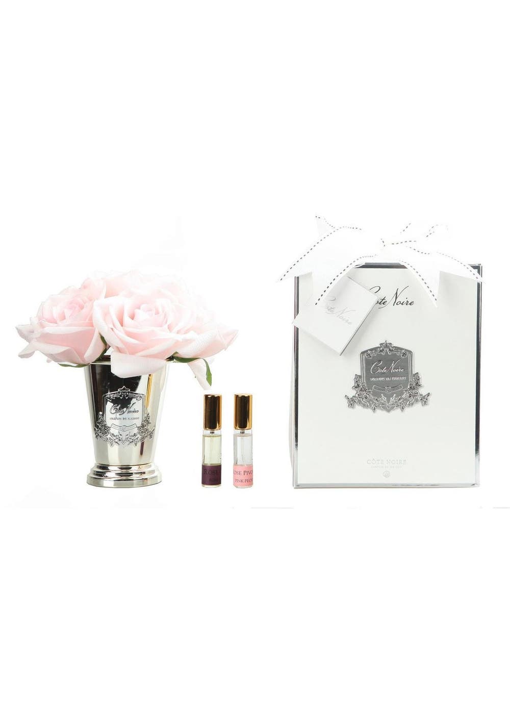 Description Taking inspiration from provincial village life, we have created a range of full-bodied fragrances combining patisserie favourites with succulent fruits & florals. The fragrances in the Cote Noire range take inspiration from the idyllic Charente countryside with each scent striving to capture a portrait of traditional French life. The fragrances encompass patisserie favourites, fragrant teas, succulent fruits and enticing florals. The flowers have been skilfully hand crafted & uses a special, natural coating to give every petal a life like touch & appearance. The petals have been infused with fine fragrance. Seven rose arrangement has been set in a Goblet with fine Fragrance & beautifully packaged in a ribboned Cote Noire box. Fragrance Notes: Pink Peony: This luxurious scent is mixed with jasmine, top notes of rose and gillyflower to create a rounded fragrance that almost recreates the delights of a fresh peony bouquet Rose Oud: Young and fragrant rose Oud warmed by the afternoon sun. A rich and innocent scent tamed with lingering notes of hibiscus Specifications ‚Äê Made in the France ‚Äê Bottom Diameter - 7cm ‚Äê Top Diameter - 19cm ‚Äê Height - 19cm ‚Äê Weight - 1.35kg