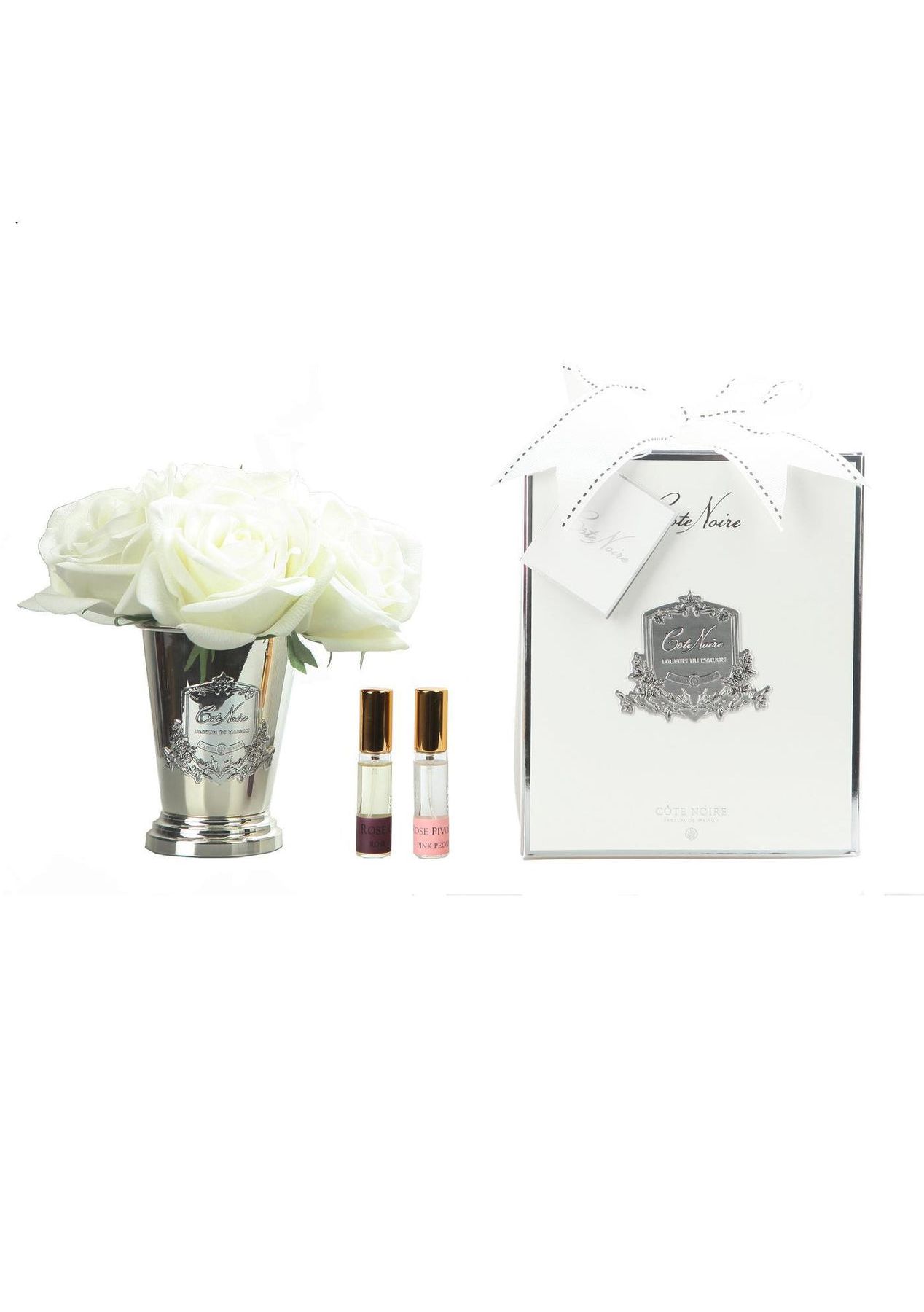 Description Taking inspiration from provincial village life, we have created a range of full-bodied fragrances combining patisserie favourites with succulent fruits & florals. The fragrances in the Cote Noire range take inspiration from the idyllic Charente countryside with each scent striving to capture a portrait of traditional French life. The fragrances encompass patisserie favourites, fragrant teas, succulent fruits and enticing florals. The flowers have been skilfully hand crafted & uses a special, natural coating to give every petal a life like touch & appearance. The petals have been infused with fine fragrance. Seven rose arrangement has been set in a Goblet with fine Fragrance & beautifully packaged in a ribboned Cote Noire box. Fragrance Notes: Pink Peony: This luxurious scent is mixed with jasmine, top notes of rose and gillyflower to create a rounded fragrance that almost recreates the delights of a fresh peony bouquet Rose Oud: Young and fragrant rose Oud warmed by the afternoon sun. A rich and innocent scent tamed with lingering notes of hibiscus Specifications ‚Äê Made in the France ‚Äê Bottom Diameter - 7cm ‚Äê Top Diameter - 19cm ‚Äê Height - 19cm ‚Äê Weight - 1.35kg