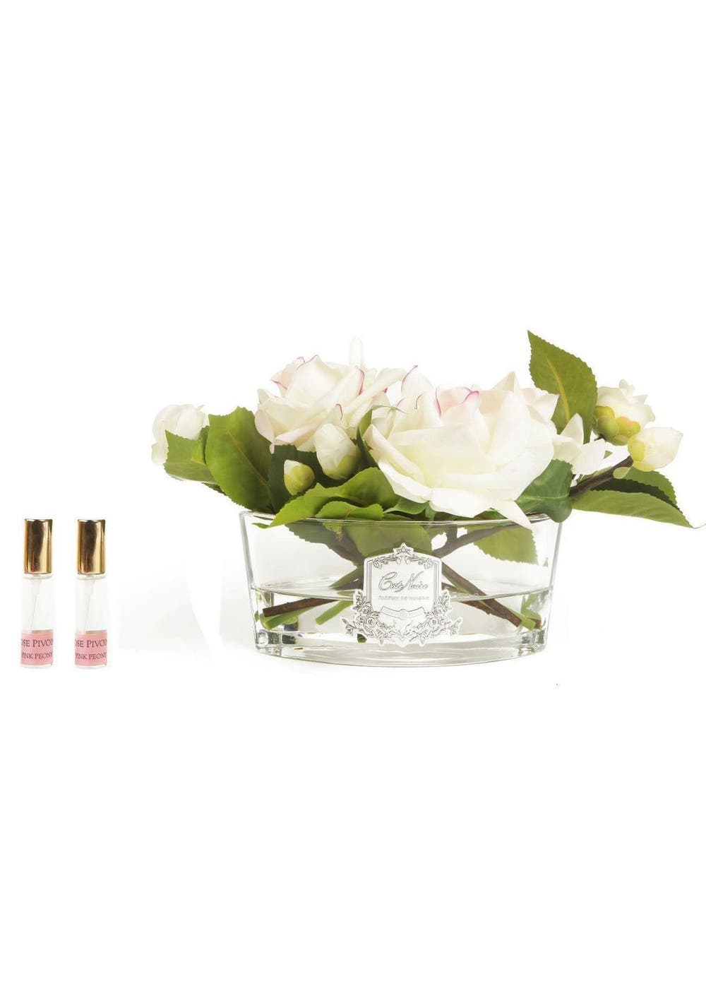 Description This beautiful life-like Rose arrangement has been set in a oval shaped glass in gel infused with fine fragrance. Each flower is skilfully hand crafted & uses a special, natural coating to give every petal a natural touch & appearance. Enclosed with your natural touch oval rose is a bottle of Peonies scented perfume, which you can spray directly onto the flowers to refresh & enhance the scent. Beautifully packaged in a ribboned oval box. Specifications ‚Äê Made in the France ‚Äê Bottom Diameter - 17cm ‚Äê Top Diameter - 28cm ‚Äê Height - 18cm ‚Äê Weight - 1.6kg