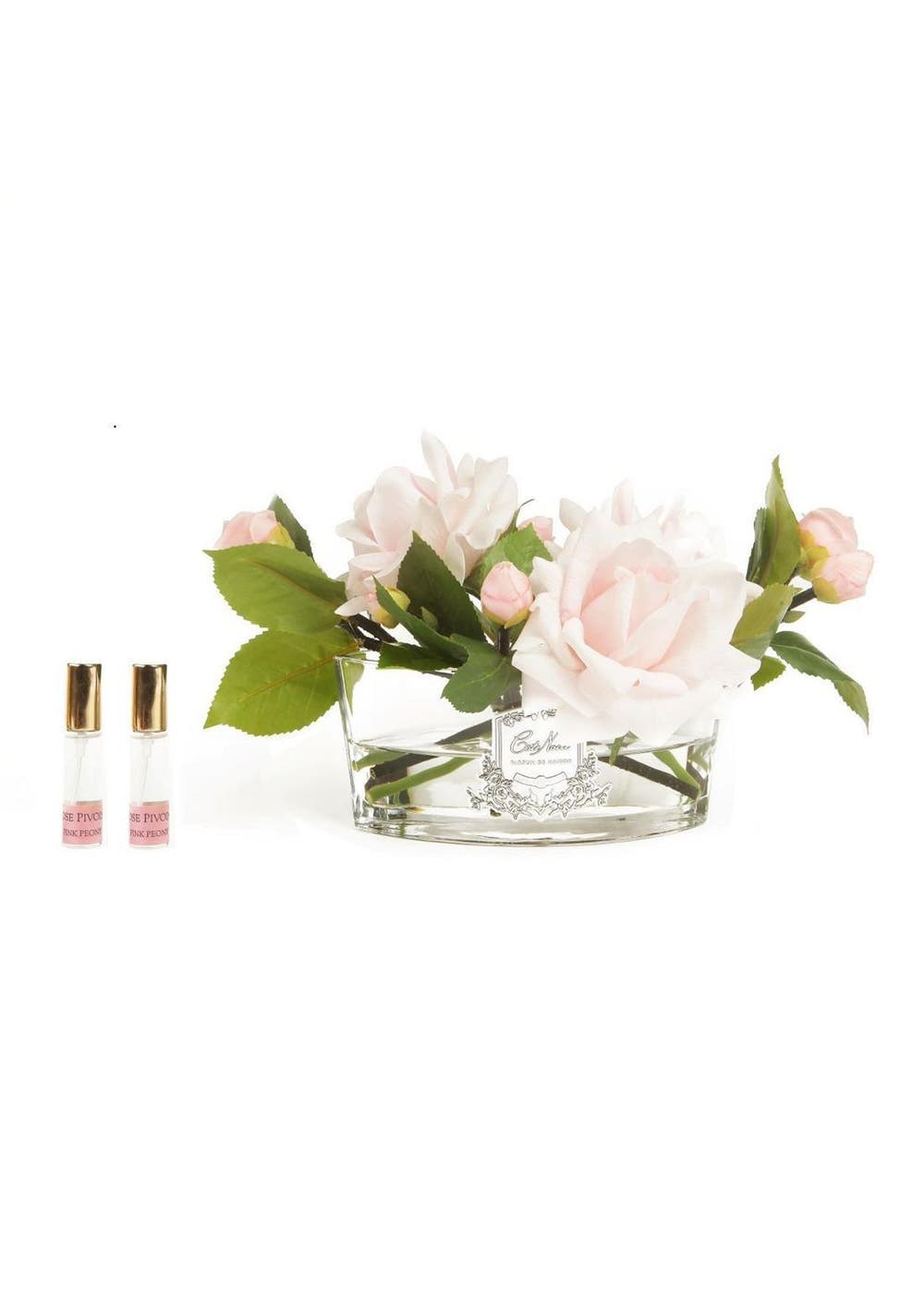 Description This beautiful life-like Rose arrangement has been set in a oval shaped glass in gel infused with fine fragrance. Each flower is skilfully hand crafted & uses a special, natural coating to give every petal a natural touch & appearance. Enclosed with your natural touch oval rose is a bottle of Peonies scented perfume, which you can spray directly onto the flowers to refresh & enhance the scent. Beautifully packaged in a ribboned oval box. Fragrance Notes: Rose Petal: Young and fragrant rose petals warmed by the afternoon sun. Top notes of pink rose layered with notes of peony and iris. A fresh, innocent scent tamed with lingering notes of hibiscus. Specifications ‚Äê Made in the France ‚Äê Bottom Diameter - 10cm ‚Äê Top Diameter - 20cm ‚Äê Height - 18cm ‚Äê Weight - 1.6kg