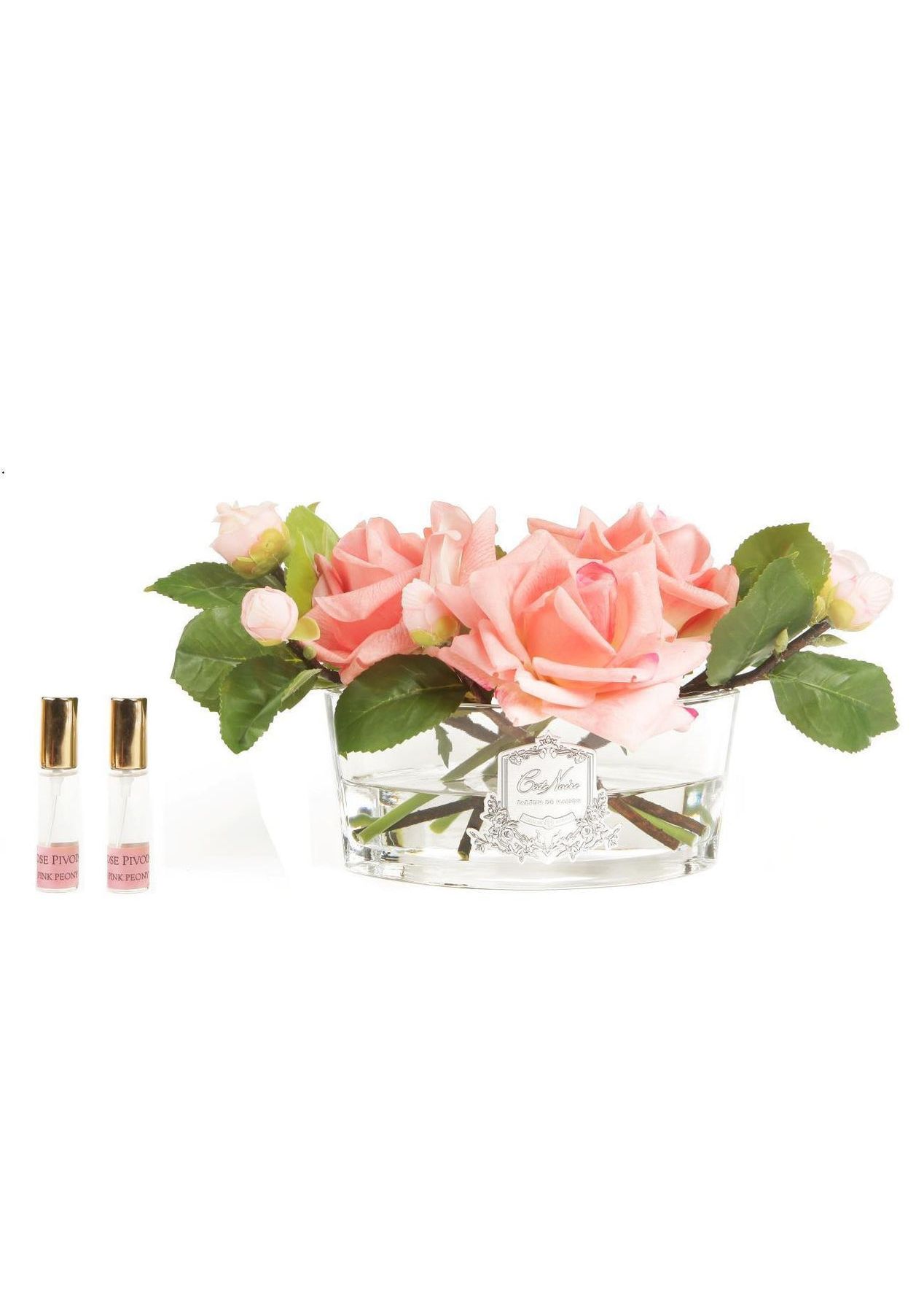 Description Taking inspiration from provincial village life, we have created a range of full-bodied fragrances combining patisserie favourites with succulent fruits & florals. The fragrances in the Cote Noire range take inspiration from the idyllic Charente countryside with each scent striving to capture a portrait of traditional French life. The fragrances encompass patisserie favourites, fragrant teas, succulent fruits and enticing florals. The flowers have been skilfully hand crafted & uses a special, natural coating to give every petal a life like touch & appearance. The petals have been infused with fine fragrance. Beautiful rose arrangement has been set in a oval shaped glass & beautifully packaged in a ribboned Cote Noire box. Fragrance Notes: Pink Peony: This luxurious scent is mixed with jasmine, top notes of rose and gilly flower to create a rounded fragrance that almost recreates the delights of a fresh peony bouquet Specifications ‚Äê Made in the France ‚Äê Bottom Diameter - 17cm ‚Äê Top Diameter - 28cm ‚Äê Height - 18cm ‚Äê Weight - 1.6kg