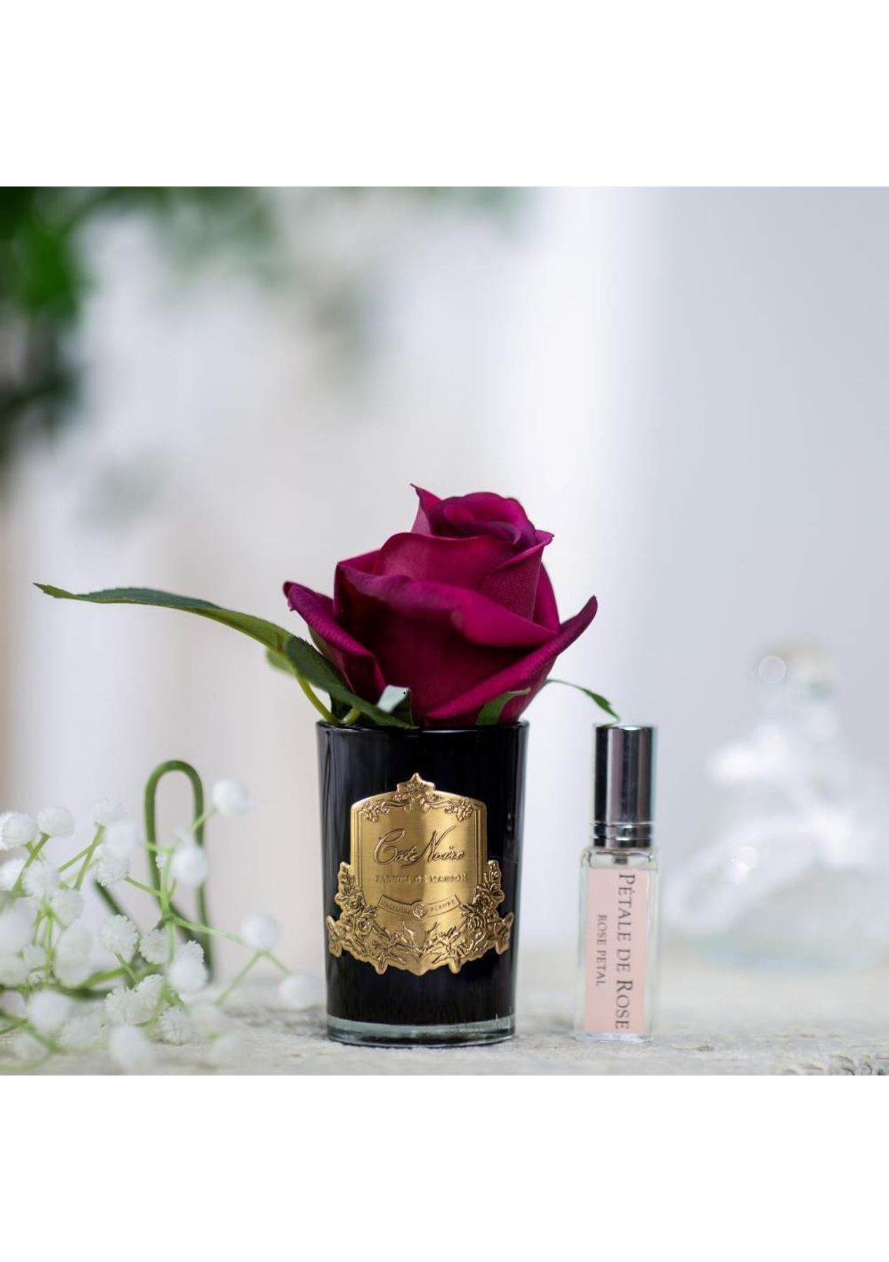 Description Taking inspiration from provincial village life, we have created a range of full-bodied fragrances combining patisserie favourites with succulent fruits & florals. The fragrances in the Cote Noire range take inspiration from the idyllic Charente countryside with each scent striving to capture a portrait of traditional French life. The fragrances encompass patisserie favourites, fragrant teas, succulent fruits and enticing florals. The flowers have been skilfully hand crafted & uses a special, natural coating to give every petal a life like touch & appearance. Each petals have been infused with fine fragrance & the arrangement includes a Rose Petal perfume spray inside the box. Fragrance Notes: Rose Petal: Young and fragrant rose petals warmed by the afternoon sun. Top notes of pink rose layered with notes of peony and iris. A fresh, innocent scent tamed with lingering notes of hibiscus. Specifications ‚Äê Made in the France ‚Äê Bottom Diameter - 5.5cm ‚Äê Top Diameter - 7cm ‚Äê Height - 13.5cm ‚Äê Weight - 0.28kg