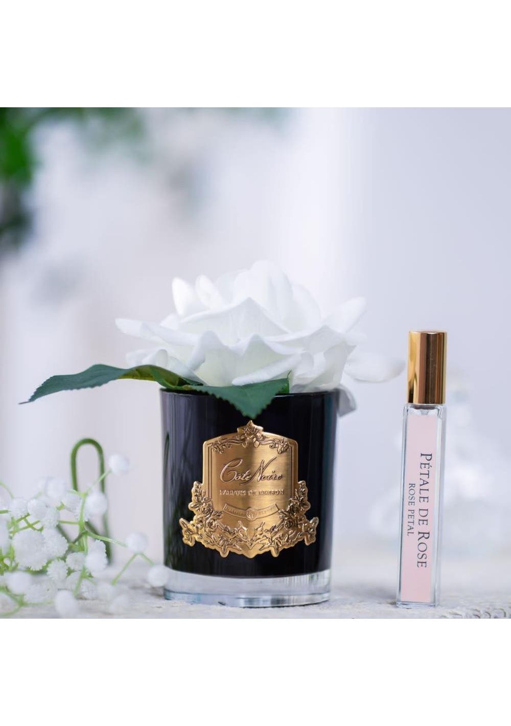 Taking inspiration from provincial village life, we have created a range of full-bodied fragrances combining patisserie favourites with succulent fruits & florals. The fragrances in the Cote Noire range take inspiration from the idyllic Charente countryside with each scent striving to capture a portrait of traditional French life. The fragrances encompass patisserie favourites, fragrant teas, succulent fruits and enticing florals. The flowers have been skilfully hand crafted & uses a special, natural coating to give every petal a life like touch & appearance. Each petals have been infused with fine fragrance & the arrangement includes a Rose Petal perfume spray inside the box.