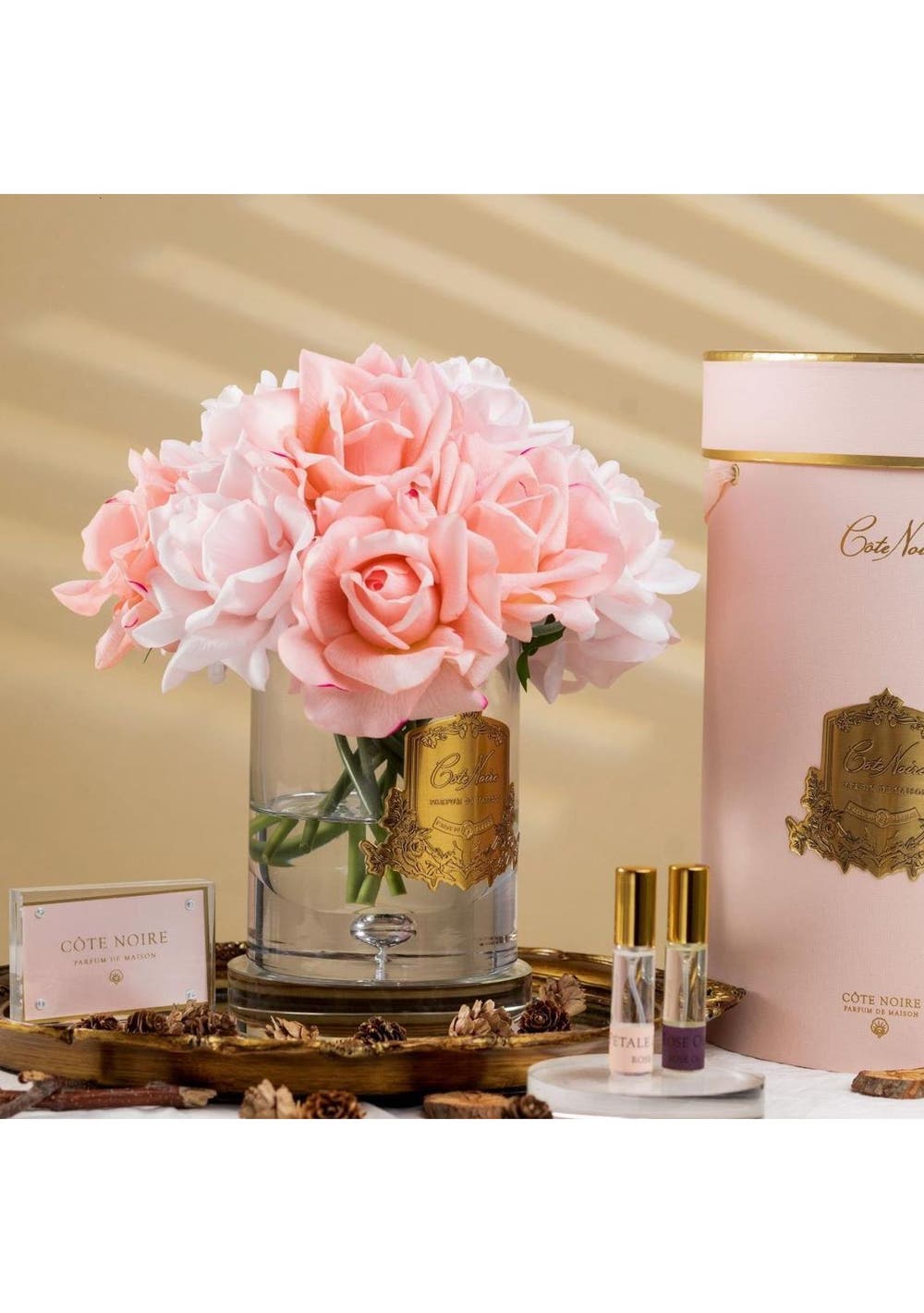 Description Taking inspiration from provincial village life, we have created a range of full-bodied fragrances combining patisserie favourites with succulent fruits & florals. The fragrances in the Cote Noire range take inspiration from the idyllic Charente countryside with each scent striving to capture a portrait of traditional French life. The fragrances encompass patisserie favourites, fragrant teas, succulent fruits and enticing florals. The flowers have been skilfully hand crafted & uses a special, natural coating to give every petal a life like touch & appearance. The petals have been infused with fine fragrance. These Luxury Grand Bouquet are beautifully packaged in a ribboned Cote Noire box. Fragrance Notes: Rose Petal: Young and fragrant rose petals warmed by the afternoon sun. Top notes of pink rose layered with notes of peony and iris. A fresh, innocent scent tamed with lingering notes of hibiscus. Rose Oud: Young and fragrant rose Oud warmed by the afternoon sun. A rich and innocent scent tamed with lingering notes of hibiscus Specifications ‚Äê Made in the France ‚Äê Bottom Diameter - 12.5cm ‚Äê Top Diameter - 26cm ‚Äê Height - 29cm ‚Äê Weight - 2.75kg