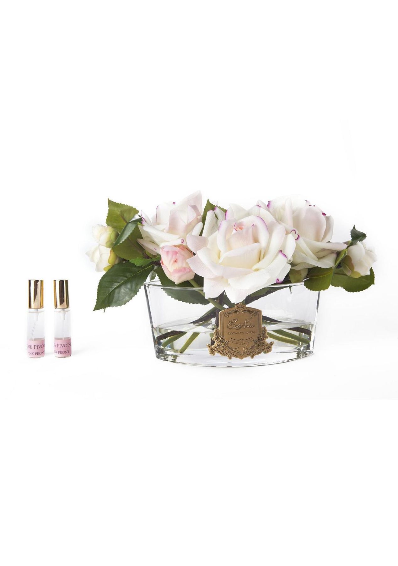 Description Taking inspiration from provincial village life, we have created a range of full-bodied fragrances combining patisserie favourites with succulent fruits & florals. The fragrances in the Cote Noire range take inspiration from the idyllic Charente countryside with each scent striving to capture a portrait of traditional French life. The fragrances encompass patisserie favourites, fragrant teas, succulent fruits and enticing florals. The flowers have been skilfully hand crafted & uses a special, natural coating to give every petal a life like touch & appearance. The petals have been infused with fine fragrance. Beautiful rose arrangement has been set in a oval shaped glass & beautifully packaged in a ribboned Cote Noire box. Fragrance Notes: Pink Peony: This luxurious scent is mixed with jasmine, top notes of rose and gilly flower to create a rounded fragrance that almost recreates the delights of a fresh peony bouquet Specifications ‚Äê Made in the France ‚Äê Bottom Diameter - 17cm ‚Äê Top Diameter - 28cm ‚Äê Height - 18cm ‚Äê Weight - 1.6kg