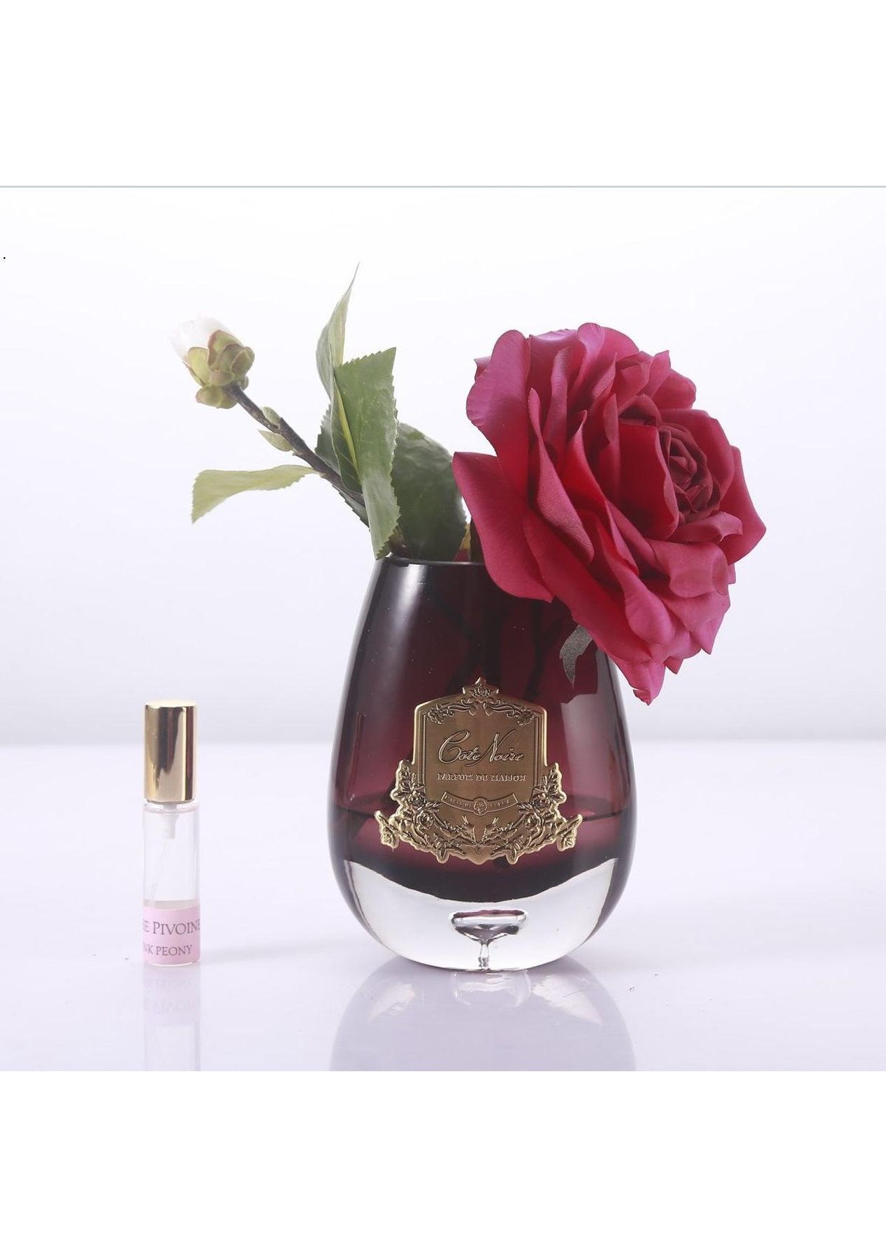 Description Taking inspiration from provincial village life, we have created a range of full-bodied fragrances combining patisserie favourites with succulent fruits & florals. The fragrances in the Cote Noire range take inspiration from the idyllic Charente countryside with each scent striving to capture a portrait of traditional French life. The fragrances encompass patisserie favourites, fragrant teas, succulent fruits and enticing florals. The flowers have been skilfully hand crafted & uses a special, natural coating to give every petal a life like touch & appearance. The petals have been infused with fine fragrance. Tea Rose arrangement has been set in a tear drop shaped glass in gel & beautifully packaged in a ribboned Cote Noire box. Fragrance Notes: Pink Peony: This luxurious scent is mixed with jasmine, top notes of rose and gilly flower to create a rounded fragrance that almost recreates the delights of a fresh peony bouquet Specifications ‚Äê Made in the France ‚Äê Bottom Diameter - 10cm ‚Äê Top Diameter - 20cm ‚Äê Height - 20cm ‚Äê Weight - 1.15kg