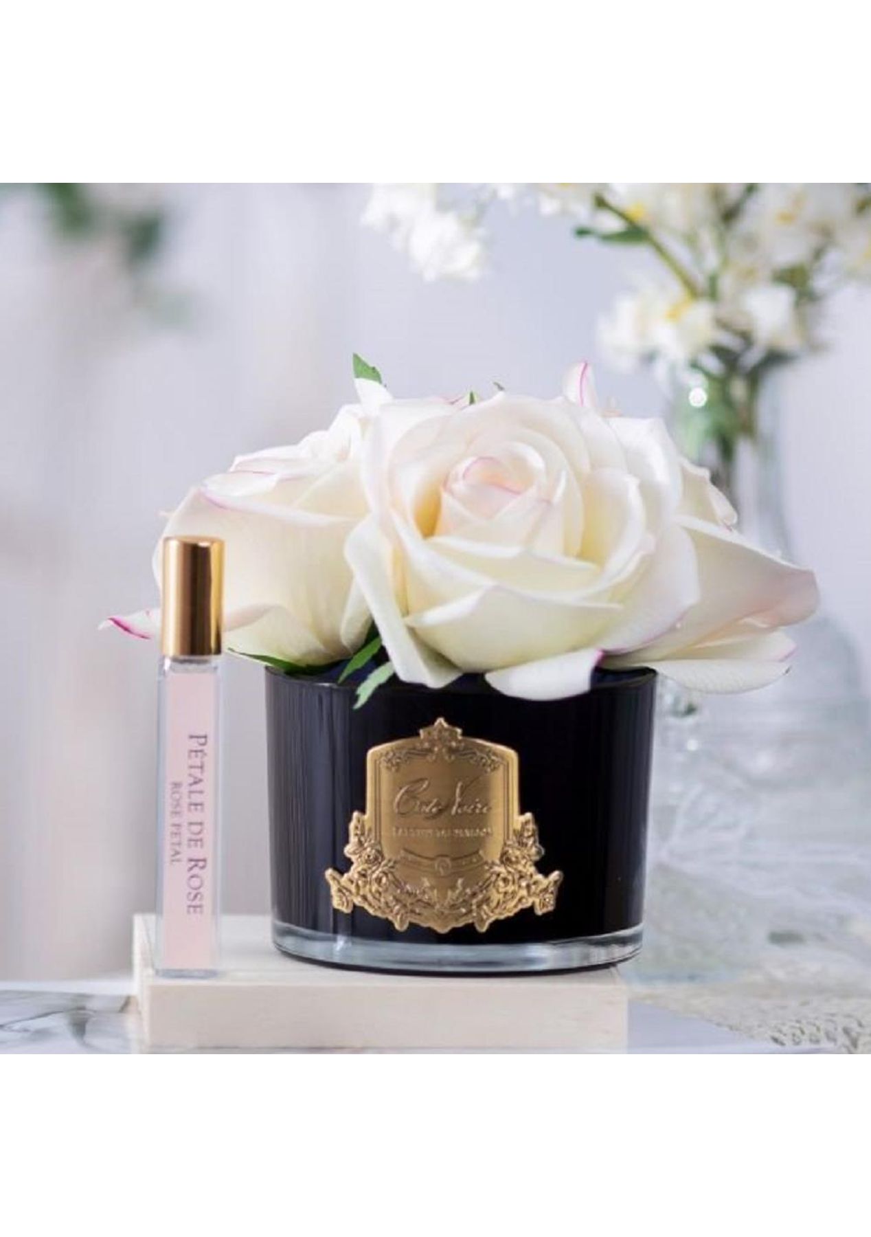 Description Taking inspiration from provincial village life, we have created a range of full-bodied fragrances combining patisserie favourites with succulent fruits & florals. The fragrances in the Cote Noire range take inspiration from the idyllic Charente countryside with each scent striving to capture a portrait of traditional French life. The fragrances encompass patisserie favourites, fragrant teas, succulent fruits and enticing florals. The flowers have been skillfully hand crafted & uses a special, natural coating to give every petal a life like touch & appearance. The petals have been infused with fine fragrance & beautifully packaged in a ribboned Cote Noire box. Fragrance Notes: Rose Petal: Young and fragrant rose petals warmed by the afternoon sun. Top notes of pink rose layered with notes of peony and iris. A fresh, innocent scent tamed with lingering notes of hibiscus. Specifications ‚Äê Made in the France ‚Äê Bottom Diameter - 10cm ‚Äê Top Diameter - 18cm ‚Äê Height - 16cm ‚Äê Weight - 1kg