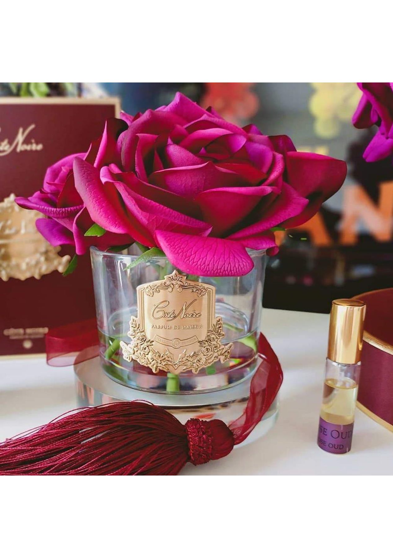 Description This beautiful life-like rose arrangement has been set in a gel infused with fine fragrance. Each flower is skilfully hand crafted & uses a special, natural coating to give every petal a natural touch & appearance. Enclosed with your natural touch rose is a bottle of oriental rose-scented perfume, which you can spray directly onto the rose to refresh & enhance the scent. Beautifully packaged in a ribboned box. Fragrance Notes: Rose Oud: Young and fragrant rose Oud warmed by the afternoon sun. A rich and innocent scent tamed with lingering notes of hibiscus Specifications ‚Äê Made in the France ‚Äê Bottom Diameter - 10cm ‚Äê Top Diameter - 18cm ‚Äê Height - 16cm ‚Äê Weight - 1kg