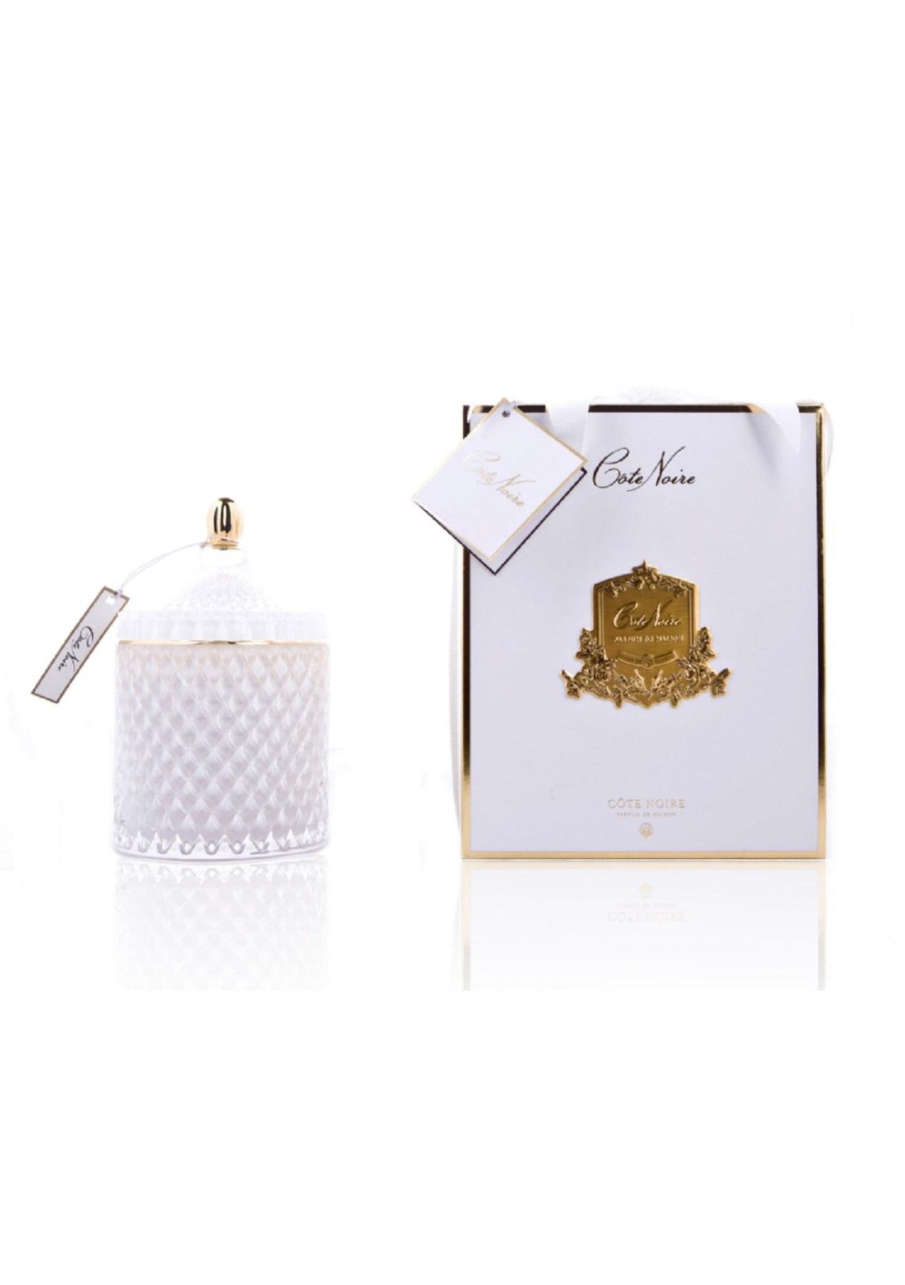 Description Beautiful Limited-Edition candles use natural blended Ecoluxe-wax combined with full bodied fragrances evokes an era of sophistication and style. These Art Deco candles comes in a decorative glass adorned with an elegant Côte Noire gift box. They also include a decorative tassel and a 5ml perfume spray to fragrance the tassel. What is included: 500 g Art deco Candle Decorative Tassel 5ml Perfume spray for the Tassel Gift Box with Bow Fragrance Notes: Jasmine Flower Tea / Fleur de the au Jasmin A unique fusion of jasmine, musk rose, hibiscus & crushed green leaves. Inspired by dappled sunlight on a white flowering garden, this aromatic fragrance will fill your room & capture your senses. Specifications ‐ Made in the France -Burn Time - 100Hours ‐ Bottom Diameter - 10.5cm ‐ Top Diameter - 10.5cm ‐ Height - 17.5cm ‐ Weight - 1.75kg