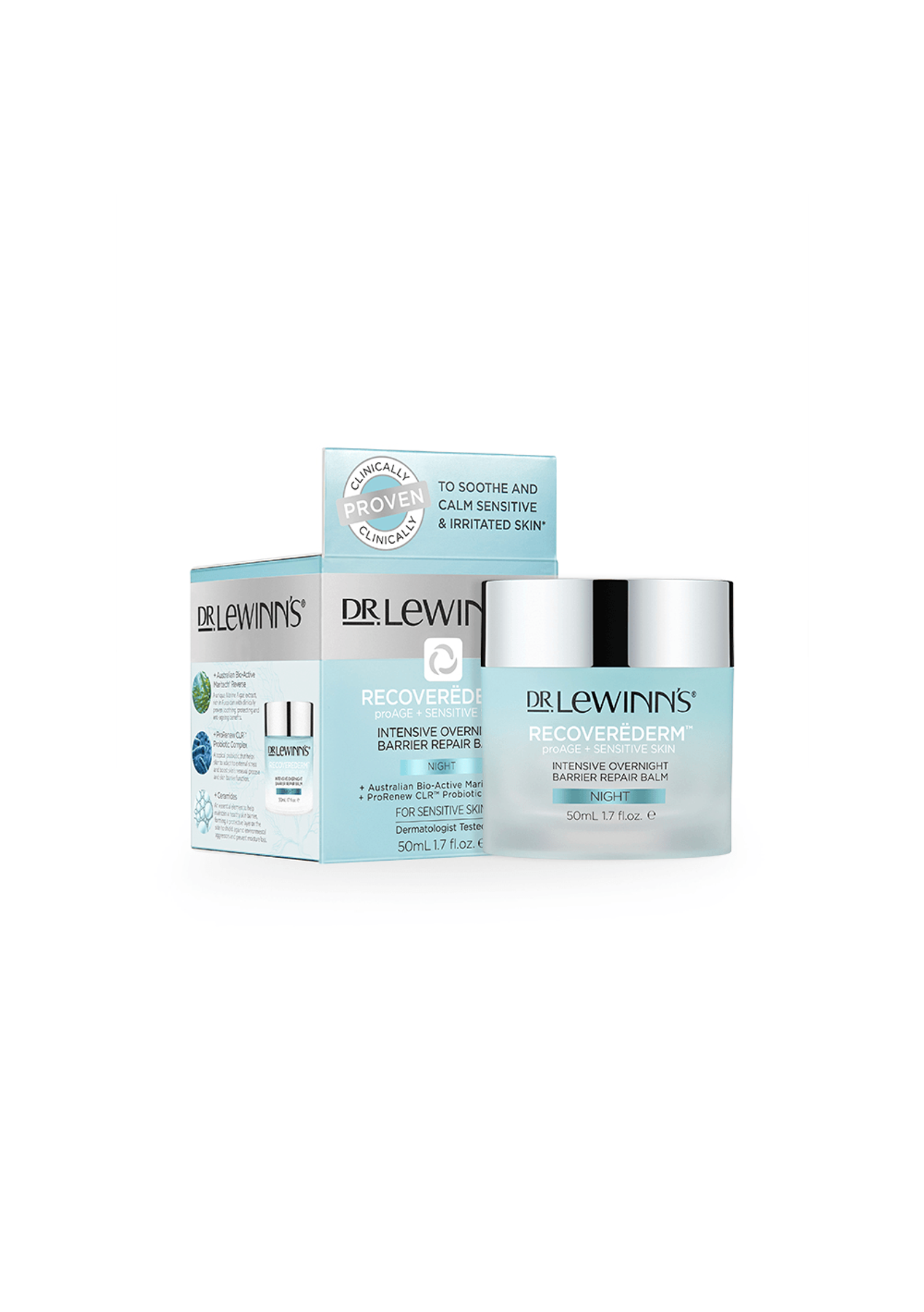 PRODUCT DETAILS + Australian Bio-Active Maritech® ReverseA unique Marine Algae extract, rich in Fucoidan with clinically proven soothing, protecting and anti-ageing benefits. + ProRenew CLR™ Probiotic ComplexA topical probiotic that helps skin to adapt to external stress and boost skin’s renewal process and skin barrier function. + CeramidesAn essential element to help maintain a healthy skin barrier, forming a protective layer on the skin to shield against environmental aggressors and prevent moisture loss. CLINICALLY PROVEN to soothe and calm sensitive and irritated skin*CLINICALLY PROVEN to increase skin hydration by up to 98% in 1 hour*100% of users noticed a reduction in skin dryness & tightness^90% of users noticed an improvement in their skin’s condition in just 1 week^95% of users noticed an improvement in skin smoothness in just 1 week^ DERMATOLOGIST TESTED FOR SENSITIVE SKIN Recommended for mild to highly sensitive, intolerant and irritated skin. Also suitable for post cosmetic treatment aftercare. *Results based on a 1 week clinical trial as part of an independent laboratory study.^Results based on a 1 week consumer trial as part of an independent laboratory study. HOW TO USE Apply a generous amount to face, neck and décolletage in the evening after cleansing and toning. To complete your skincare regime, use with the Recoverëderm Range. INGREDIENTS Water (Aqua), Caprylic/Capric Triglyceride, Lactococcus Ferment Lysate (ProRenew CLR™ Probiotic Complex), Cetearyl Alcohol, Glycerin, Stearic Acid, Sodium Polyacrylate, Glyceryl Caprylate, Coco-Caprylate, Squalane, Undaria Pinnatifida Extract (Maritech® Reverse Marine Algae), Bisabolol, Canola Oil, Sodium Benzoate, Caprylyl Glycol, Ricinus Communis (Castor) Seed Oil, Tocopheryl Acetate (Vit. E), Propanediol, Butylene Glycol, Polyhydroxystearic Acid, Sodium Lauroyl Lactylate, PEG-100 Stearate, Glyceryl Stearate, Euphorbia Cerifera (Candelilla) Cera, Helianthus Annuus (Sunflower) Seed Wax, Lactic Acid, Rhodosorus Marinus Extract, Sodium Chloride, Ceramide NP, Ceramide AP, Ceramide EOP, Phenoxyethanol, Phytosphingosine, Cholesterol, Tasmannia Lanceolata (Tazman Berry) Fruit/Leaf Extract, Xanthan Gum, Carbomer, Ethylhexylglycerin, Centipeda Cunninghamii Extract (Cehami ®), Dextran, Palmitoyl Tripeptide-8 (Neutrazen™), Potassium Sorbate # 181103D Please be aware that ingredient lists may change or vary from time to time. Please refer to the ingredient list on the product package you receive for the most up to date list of ingredients. WARNINGS AND STORAGE INSTRUCTIONS For external use only. Avoid direct contact with eyes. Rinse with water if irritation occurs. We recommend patch testing before use. Store below 30°C. Maritech® is a licensed trademark of Marinova Pty Ltd Australia.