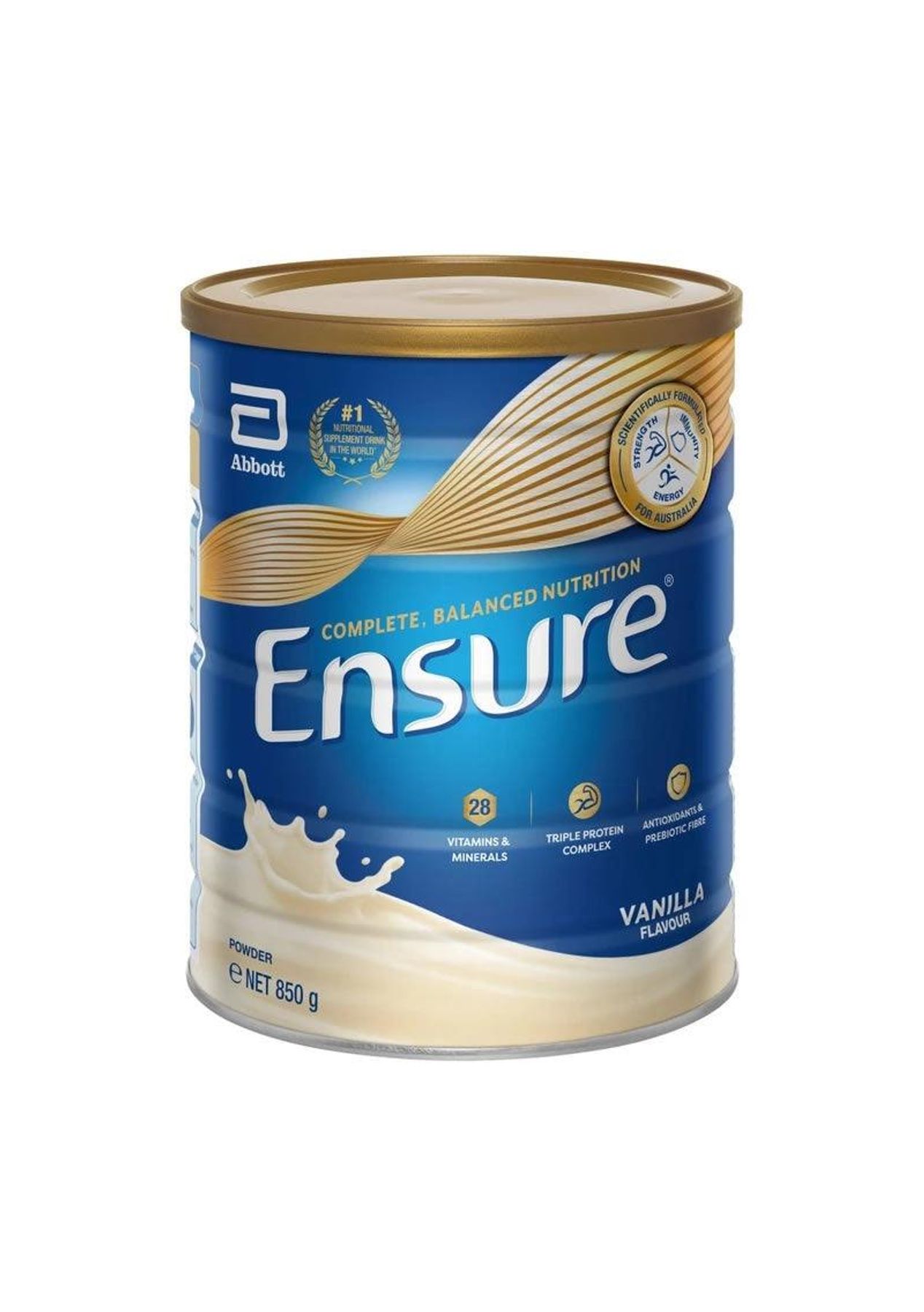 Ensure is a 1.0kcal/ml, nutritionally complete and balanced powdered milkshake style oral nutritional supplement for people with, or at risk of developing, disease-related malnutrition1. Ensure powder provides calories, protein & carbohydrates to help you gain or maintain a healthy weight.1 Ensure Powder 850g is available in vanilla & chocolate flavours. FEATURES 28 essential vitamins and minerals FOS prebiotic to support immune health Calcium necessary for normal bone structure Vitamin D contributes to support normal muscle function Antioxidant to support immune health PRECAUTIONS Food for Special Medical Purposes. Use only under medical supervision. Ensure Powder is suitable as a sole source of nutrition or as a supplement Not for Parenteral use Not for use in galactosemia Not intended for use in children unless otherwise instructed by a health care professional PREPARATION Use Instructions To prepare a 230ml serving, put 195ml of cold water into a glass. Gradually add 6 level scoops (scoop in the can) or 53.8g of Ensure® Powder and stir until dissolved. An 850g can of powder yields approximately 16 x 230mL servings. Opened can should be covered and stored in a cool, dry place, but NOT refrigerated. Store unopened cans at room temperature. Once opened, use contents within 3 weeks. Reconstituted Ensure® should be used promptly or covered, refrigerated and used within 24 hours. INGREDIENTS List of ingredients in descending order: Hydrolysed corn starch, maltodextrin, sucrose, VEGETABLE OILS (high oleic sunflower oil, soy oil, canola oil), milk protein concentrate, oligofructose (FOS), soy protein isolate, MINERALS (sodium citrate, potassium citrate, magnesium chloride, potassium chloride, calcium phosphate tribasic, zinc sulphate, ferrous sulphate, manganese sulphate, cupric sulphate, potassium iodide, sodium molybdate, chromium chloride, sodium selenate), flavouring, choline chloride, VITAMINS (ascorbic acid, calcium pantothenate, Vitamin E, niacinamide, pyridoxine hydrochloride, riboflavin, Vitamin A palmitate, thiamin hydrochloride, beta carotene, folic acid, phylloquinone, biotin, Vitamin D3, cyanocobalamin), antioxidant (304), antioxidant (307b). May contain: calcium carbonate, potassium phosphate dibasic, magnesium sulphate, sodium chloride CONTAINS: Soy and Milk ingredients