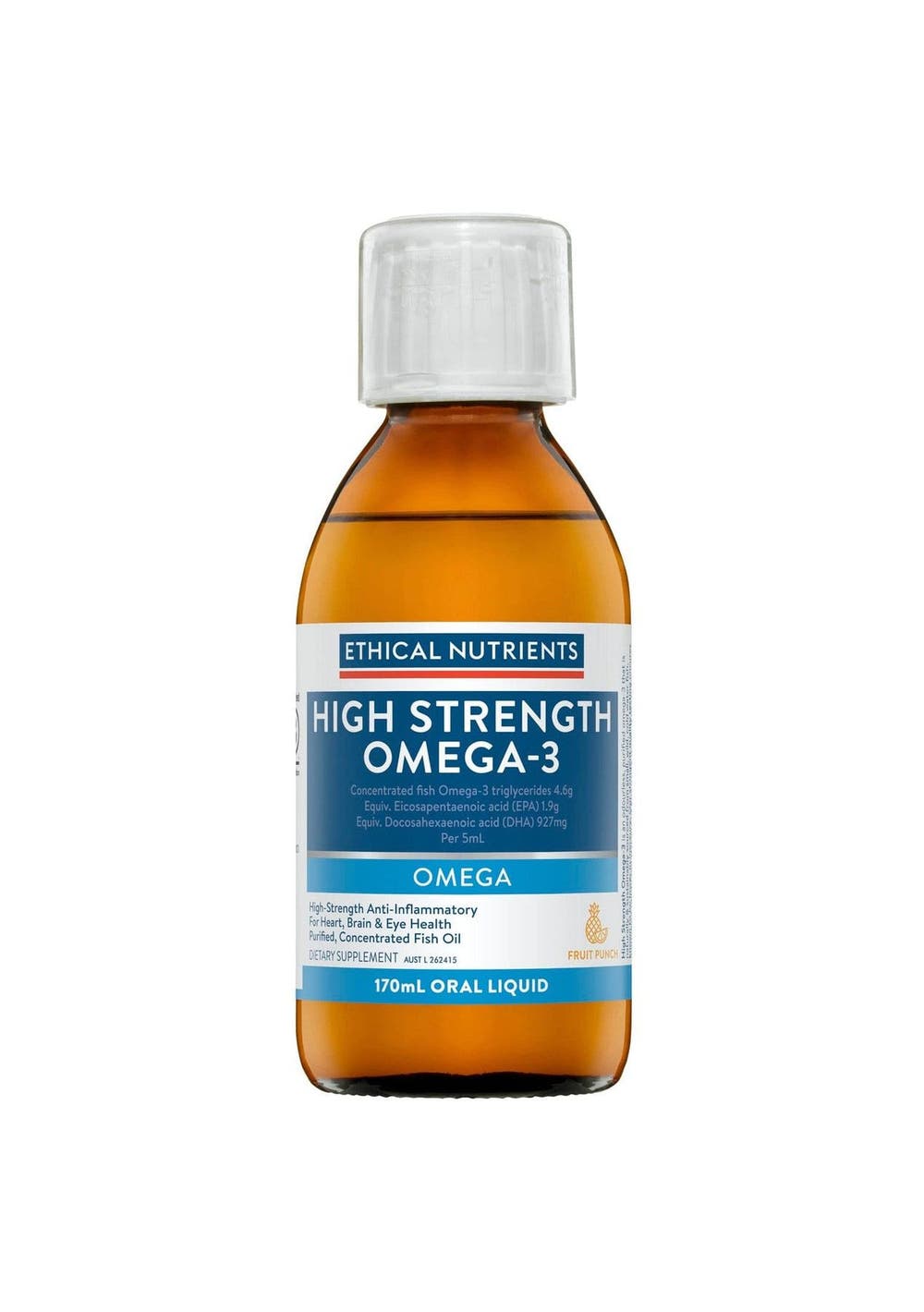 Description Ethical Nutrients High Strength Omega-3 is a purified, bioavailable, odourless fish oil. Ethical Nutrients High Strength Omega-3 is a supplement for joint health, cognitive function and cardiovascular health, in healthy people, it helps to:- Support joint health- Support a healthy cardiovascular system- Assist heart health- Support cholesterol balance- Support healthy brain developmentEthical Nutrients sources naturally from ocean fresh, wild fish and combines state of the art freshness and purification techniques, testing for pesticides and heavy metals including lead, mercury and arsenic to produce a high quality, stable fish oil range for you and your family. Our high strength omega-3 It undergoes molecular distillation to provide high quality and purity. Ingredients Each 5mL (1 metric teaspoon) contains:Concentrated fish Omega-3 triglycerides 4.6gEquiv. Eicosapentaenoic acid (EPA) 1.9gEquiv. Docosahexaenoic acid (DHA) 927mg Suggested Use Shake well before opening. Mix with a small amount of juice, or take with food if preferred. Adults: To help relieve symptoms of mild arthritis and support healthy cognitive function:Take 5mL (1 metric teaspoon) daily.To help maintain cardiovascular health or to assist heart health: Take 1.25mL (1/4 metric teaspoon) daily.Children: For healthy cognitive function:2-5 years: Take 1.25mL (1/4 metric teaspoon) daily.6-12 years: Take 2.5mL (1/2 metric teaspoon) daily. Additional Product Information Warnings If symptoms persist consult your healthcare professional. Do not use if cap and/or bottle seals are missing or broken. Contains fish and sucralose.