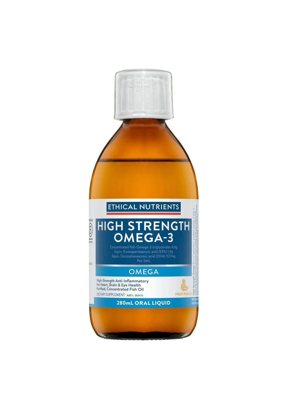 Description Ethical Nutrients High Strength Omega-3 is a purified, bioavailable, odourless fish oil. Ethical Nutrients High Strength Omega-3 is a supplement for joint health, cognitive function and cardiovascular health, in healthy people, it helps to:- Support joint health- Support a healthy cardiovascular system- Assist heart health- Support cholesterol balance- Support healthy brain developmentEthical Nutrients sources naturally from ocean fresh, wild fish and combines state of the art freshness and purification techniques, testing for pesticides and heavy metals including lead, mercury and arsenic to produce a high quality, stable fish oil range for you and your family. Our high strength omega-3 It undergoes molecular distillation to provide high quality and purity. Ingredients Each 5mL (1 metric teaspoon) contains:Concentrated fish Omega-3 triglycerides 4.6gEquiv. Eicosapentaenoic acid (EPA) 1.9gEquiv. Docosahexaenoic acid (DHA) 927mg Suggested Use Shake well before opening. Mix with a small amount of juice, or take with food if preferred. Adults: To help relieve symptoms of mild arthritis and support healthy cognitive function:Take 5mL (1 metric teaspoon) daily.To help maintain cardiovascular health or to assist heart health: Take 1.25mL (1/4 metric teaspoon) daily.Children: For healthy cognitive function:2-5 years: Take 1.25mL (1/4 metric teaspoon) daily.6-12 years: Take 2.5mL (1/2 metric teaspoon) daily. Additional Product Information Warnings If symptoms persist consult your healthcare professional. Do not use if cap and/or bottle seals are missing or broken. Contains fish and sucralose.