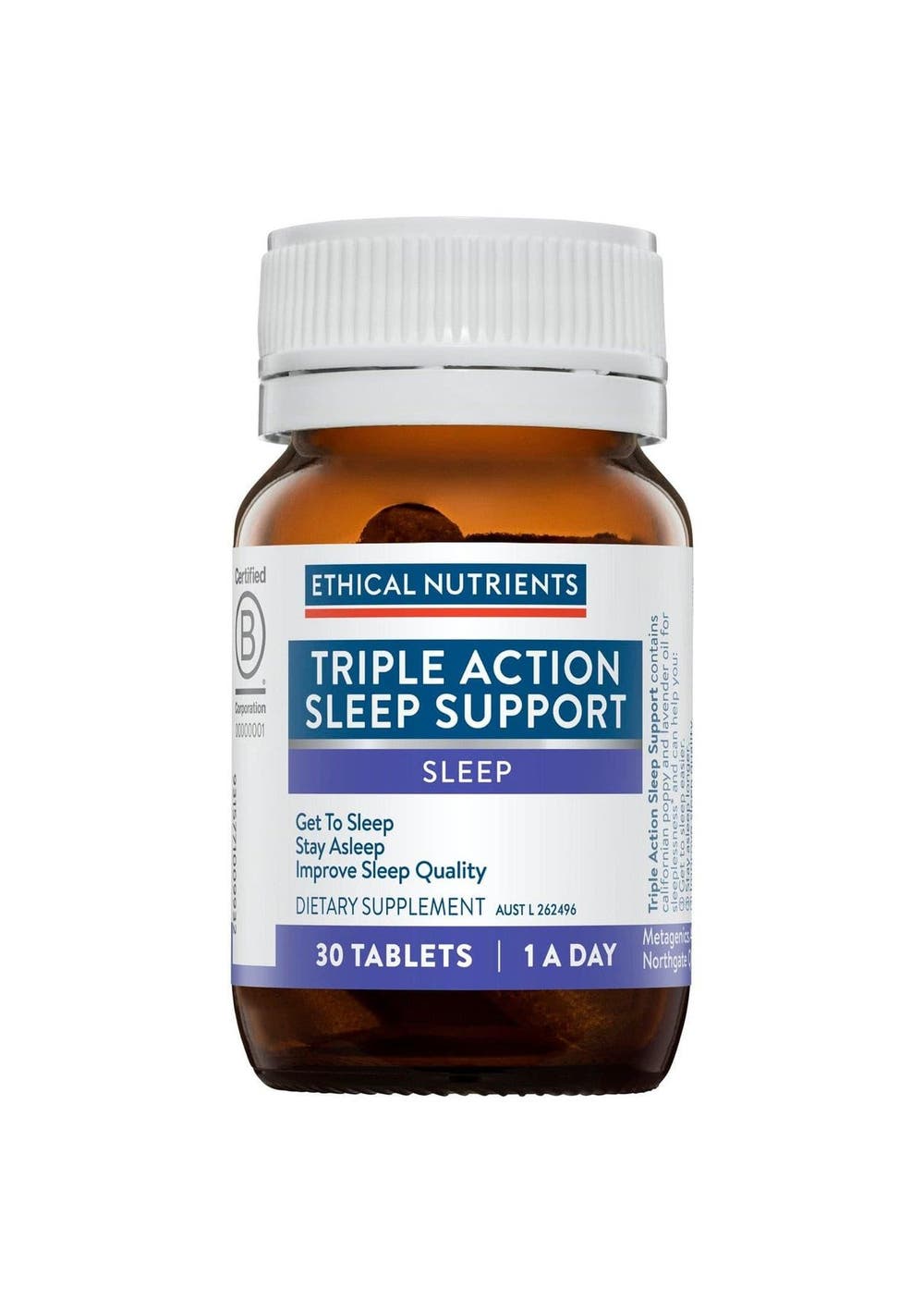 Description Ethical Nutrients Triple Action Sleep Support contains traditional herbs, Zizyphus, California Poppy and Lavender to help support a sound night's sleep. TAPS NA 10467 Ethical Nutrients Triple Action Sleep Support contains traditional Western and Chinese herbs that may help you:- Get to sleep easier.- Stay asleep longer.- Improve sleep quality.Triple Action Sleep Support may support a sound sleep. Enjoy a lavender aroma when taking this product. Ingredients EACH TABLET CONTAINS:Ziziphus jujuba var.spinosadry seed extract 556mg from dry seed (Zizyphus) 10gEschscholzia californicadry herb flowering extract 250mg from dry herb flowering (California Poppy) 1.5gLavender oil (Lavandula angustifolia essential oil) 80mg Suggested Use Take 1 tablet with your evening meal.Or as directed by a healthcare professional. Additional Product Information Warnings If symptoms persist consult your healthcare professional. Do not use if cap and/or bottle seals are missing or broken.