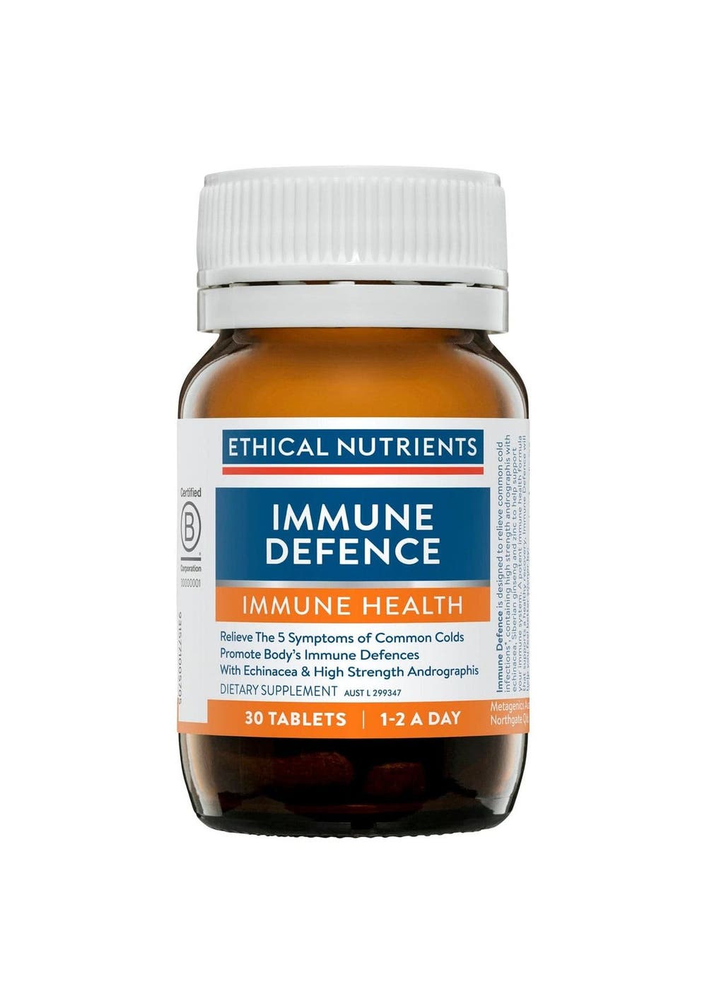 Description Immune Defence provides support for your immune system to defend during ills & chills, with a combination of Andrographis, Echinacea, Turmeric, Siberian Ginseng & Zinc. - Support during ills & chills- Support sound sleep- Support for body’s immune defences- Teared dosing 1 a day for immune support 2 a day during ills & chills- Hight strength Andrographis- Easily absorbed forms of Zinc (Meta Zn®) & Turmeric (BCM-95™) Ingredients EACH TABLET CONTAINS:Andrographis paniculatadry whole plant extract 375mgfrom dry whole plant (King of Bitters) 6gEleutherococcus senticosusdry root extract 143mgfrom dry root (Siberian ginseng) 2gEchinacea purpureadry whole plant extract 150mgfrom dry whole plant (Echinacea) 1.5gCurcuma longadry rhizome extract 40mgfrom dry rhizome (BCM-95™ Turmeric) 1gZinc amino acid chelate (Meta Zn® - Zinc diglycinate) 60mgEquiv. Zinc 12mg Suggested Use For immune support:Take 1 tablet daily with food. To relieve the symptoms and reduce severity of common cold:Take 1 tablet twice daily with food.Or as directed by a healthcare professional. Additional Product Information Warnings If symptoms persist consult your healthcare professional. Do not use if cap and/or bottle seals are missing or broken. Andrographis may cause allergic reactions in some people. If you have a severe reaction (such as anaphylaxis) stop use and seek immediate medical attention. Not to be used in children under five years of age.