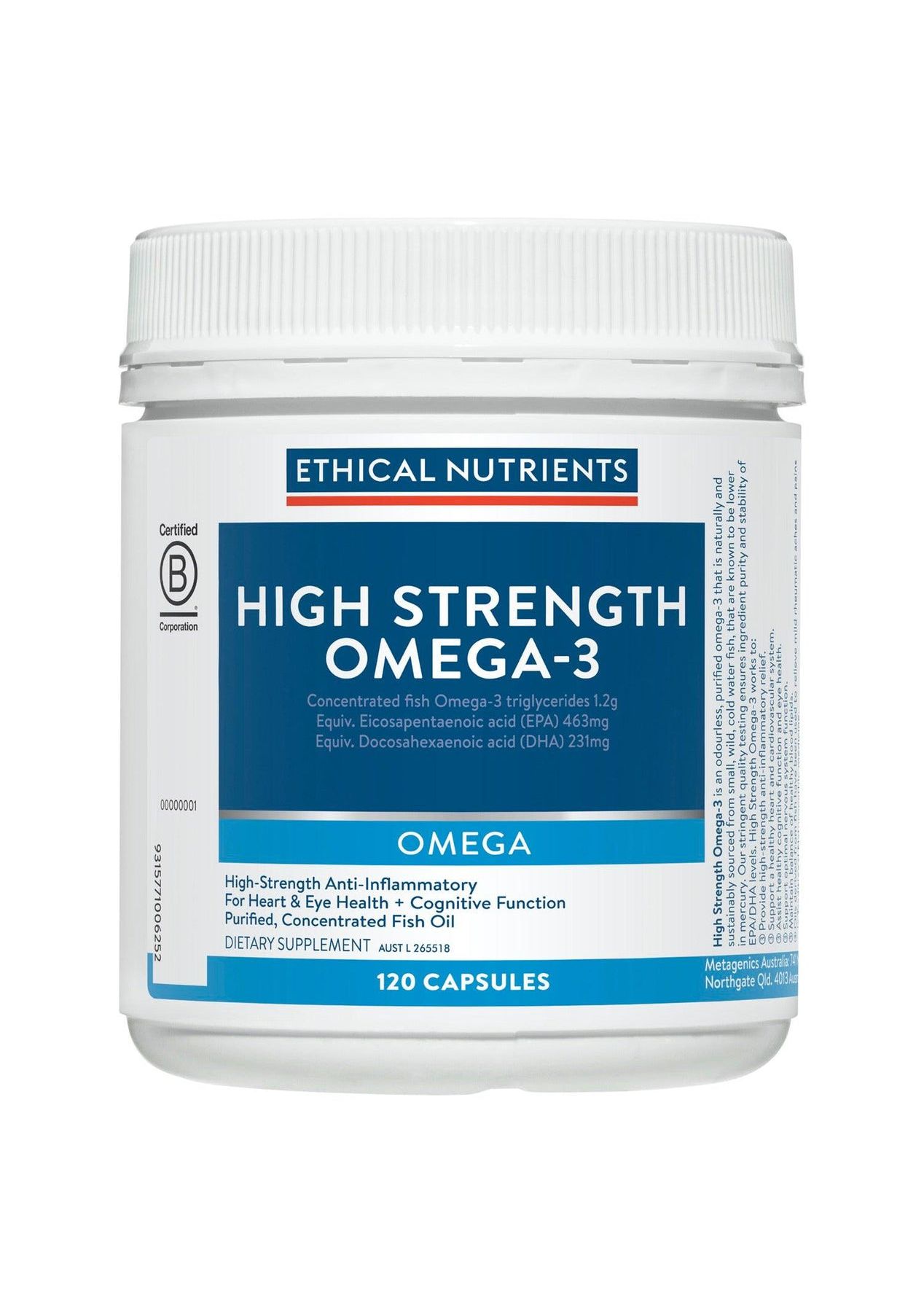 Description Ethical Nutrients High Strength Omega-3 for heart and eye health + cognitive function. High Strength Omega-3 is an odourless, purified omega-3 that is naturally and sustainably sourced from small, wild, cold water fish,that are known to be lower in mercury. Our stringent quality testing ensures ingredient purity and stability of EPA/DHA levels. High Strength Omega-3 works to: Provide high-strength anti-inflammatory relief.Support a healthy heart and cardiovascular system.Assist healthy cognitive function and eye health.Support optimal nervous system function.Maintain a balance of healthy blood lipids.Oils derived from fish have been used to relieve mild rheumatic aches and pains in Traditional Naturopathic medicine.Support a healthy pregnancy.Ethical Nutrients sources naturally from ocean fresh, wild fish and combines state of the art freshness and purification techniques, testing for pesticides and heavy metals includinglead, mercury and arsenic to produce a high quality, stable fish oil range for you and your family. Ingredients Each capsule contains:Concentrated Fish Omega-3 Triglycerides 1.2 g.Equiv. Eicosapentaenoic Acid (EPA) 463 mg.Equiv. Docosahexaenoic Acid (DHA) 231 mg. Suggested Use To relieve inflammation, support the nervous system, and maintain healthy blood lipids: Take 1 capsule twice daily with food.To maintain cardiovascular and heart health: Take 1 capsule daily with food.To support pregnancy: Take 1 capsule daily with food.Or take as directed by a healthcare professional. Children 2 - 12 years: Take Ethical Nutrients High Strength Omega-3 Fresh Mint or Fruit Punch or High Strength Omega-3 Kids. Additional Product Information Warnings If symptoms persist consult your healthcare professional. Do not use if cap and/or bottle seals are missing or broken. Contain Fish
