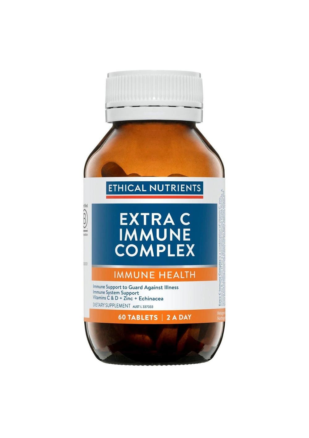 Description Extra C Immune Complex is a combination of vitamin C, zinc, echinacea & vitamin D for a specialised immune health formula. A strong and healthy immune system helps fight against illness and build immune resilience. Take daily for healthy immune system function. Ingredients EACH TABLET CONTAINSAscorbic acid (Vitamin C) 500mgZinc amino acid chelate 25mg Equiv. Zinc 5.0mgColecalciferol 7.5 microgramsEquiv. Vitamin D3 300IUEchinacea purpureadry root and rhizome extract 125mgfrom dry root and rhizome (Echinacea) 750m Suggested Use Take 1 tablet twice daily with food or as directed by a healthcare professional. Additional Product Information Warnings Vitamin and mineral supplements should not replace a balanced diet. If symptoms persist consult your healthcare professional. Do not use if cap and/or bottle seals are missing or broken. Not to be used in children under two years of age without medical advice.