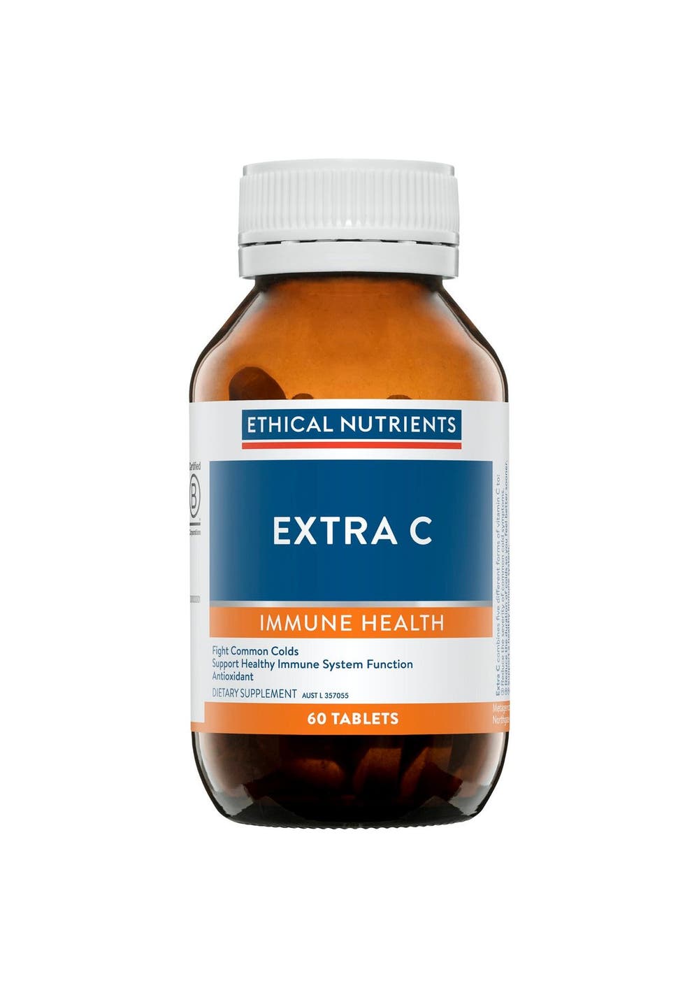 Description Ethical Nutrients Extra C is antioxidant. Fight common colds and relieve mild allergy symptoms. Extra C combines five different forms of vitamin C to: - Assist in the management of common colds by reducing the severity and duration of symptoms. - Help relieve mild allergy symptoms and reduce the severity of mild upper respiratory tract infections. - Support minor wound healing & promote healthy skin, bones & teeth. - Provide antioxidant benefits and reduce free radicals formed in the body. Extra C contains non-acidic vitamin C with hesperidin for enhanced absorption. Ingredients Each tablet contains:Calcium ascorbate dihydrate 780mgEquiv. Ascorbic acid (Vitamin C) 640mgNicotinamide ascorbate 256mgEquiv. Ascorbic acid (Vitamin C)151mgEquiv. Nicotinamide 105mgSodium ascorbate 139mgEquiv. Ascorbic acid (Vitamin C)123mgMagnesium ascorbate 55mgEquiv. Ascorbic acid (Vitamin C) 49mgPotassium ascorbate 24mgEquiv. Ascorbic acid (Vitamin C) 17mgHesperidin 18mgCysteine hydrochloride 9.7mg Suggested Use Take 1 tablet daily or as directed by a healthcare professional. Additional Product Information Warnings Not suitable for children under two years of age without medical advice.Vitamin supplements should not replace a balanced diet. If symptoms persist consult your healthcare professional.Do not use if cap and/or bottle seals are missing or broken.