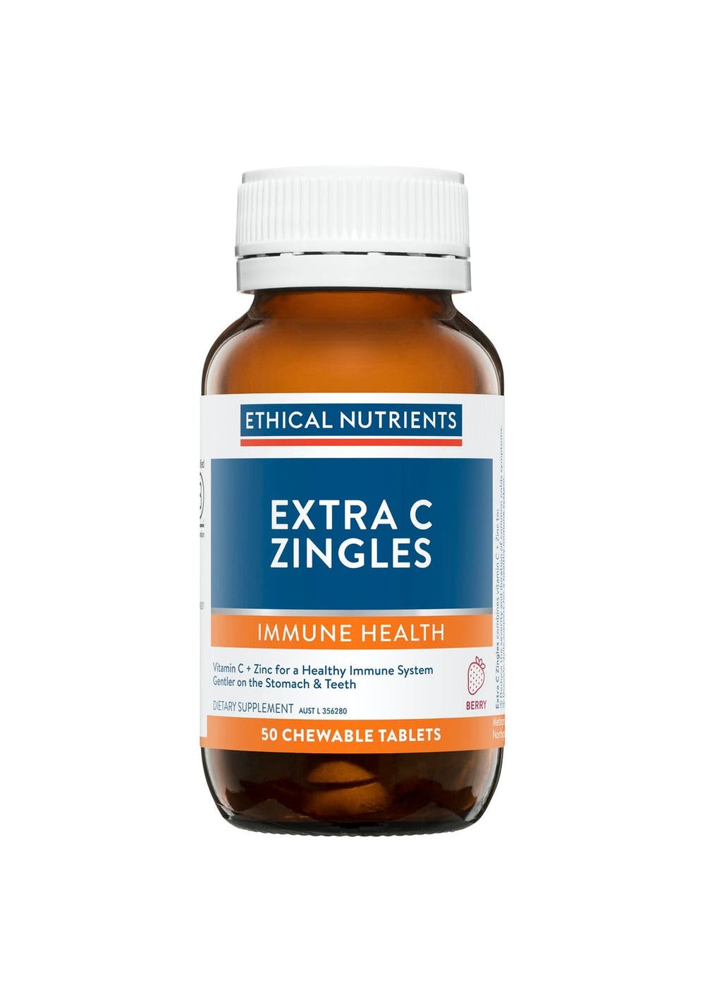 Description Ethical Nutrients Extra C Zingles provide daily immune support with vitamin C & Zinc in a zingy chewable tablet for the whole family. Now more than ever families and children should maintain a strong immune system all year around and build immune resilience to avoid succumbing to illness easily.- Support a strong immune system- Provide daily immune support- Assist in the prevention of vitamin C deficiency when dietary intake is inadequate- Low acidity vitamin C - gentle on the teeth and stomach- Zingy chewable tablet- One a day- Available in two delicious flavours Berry or Orange- Ideal for the kids – from 5 years+ Ingredients EACH TABLET CONTAINS:Ascorbic acid (Vitamin C) 500mgCalcium ascorbate dihydrate 303mgEquiv. Ascorbic acid (Vitamin C) 250mgSodium ascorbate 281mgEquiv. Ascorbic acid (Vitamin C) 250mgTotal Vitamin C (Ascorbic acid) 1000mgZinc sulfate monohydrate 27mgEquiv. elemental Zinc 10mg Suggested Use AdultsGeneral immunity: Chew 1 tablet daily with food.During a cold: Chew 4 tablets daily with food. Children 5 years & overGeneral immunity: Chew 1/2 tablet daily with food.During a cold: Chew 1 tablet daily with food.Or as directed by a healthcare professional. Additional Product Information Warnings Do not use if cap and/or bottle seals are missing or broken. If symptoms persist consult your healthcare professional. Not to be used in children under two years of age without medical advice. Vitamin and mineral supplements should not replace a balanced diet. Contains zinc, which may be dangerous if taken in large amounts or for a long period. Contains Sucralose.