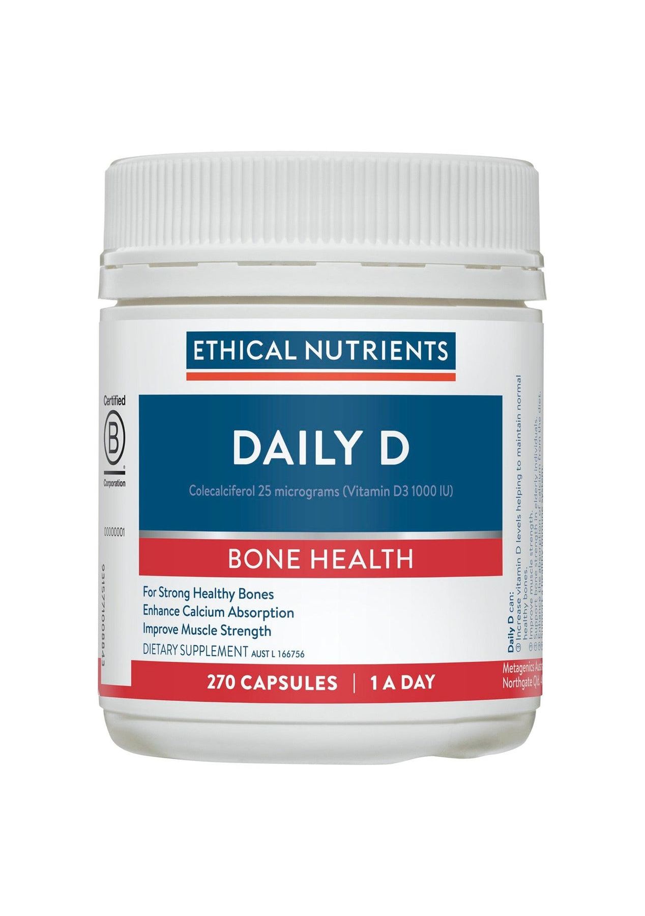 Description Research shows that many people may be at risk of inadequate vitamin D levels due to poor dietary intake and insufficient sun exposure. Ethical Nutrients Daily D helps maintain healthy levels of Vitamin D for strong and healthy bones. This supplement may: - Support maintenance of normal healthy bones- Enhance the absorption of calcium from the diet.- Support a healthy immune system. Ingredients EACH CAPSULE CONTAINS: Colecalciferol (Vitamin D3) 25 micrograms Equiv. Vitamin D3 1000 IU Suggested Use Take 1 capsule daily with food.Or as directed by a healthcare professional. Additional Product Information Warnings Vitamin supplements should not replace a balanced diet.If symptoms persist consult your healthcare professional.Do not use if cap and/or bottle seals are missing or broken.