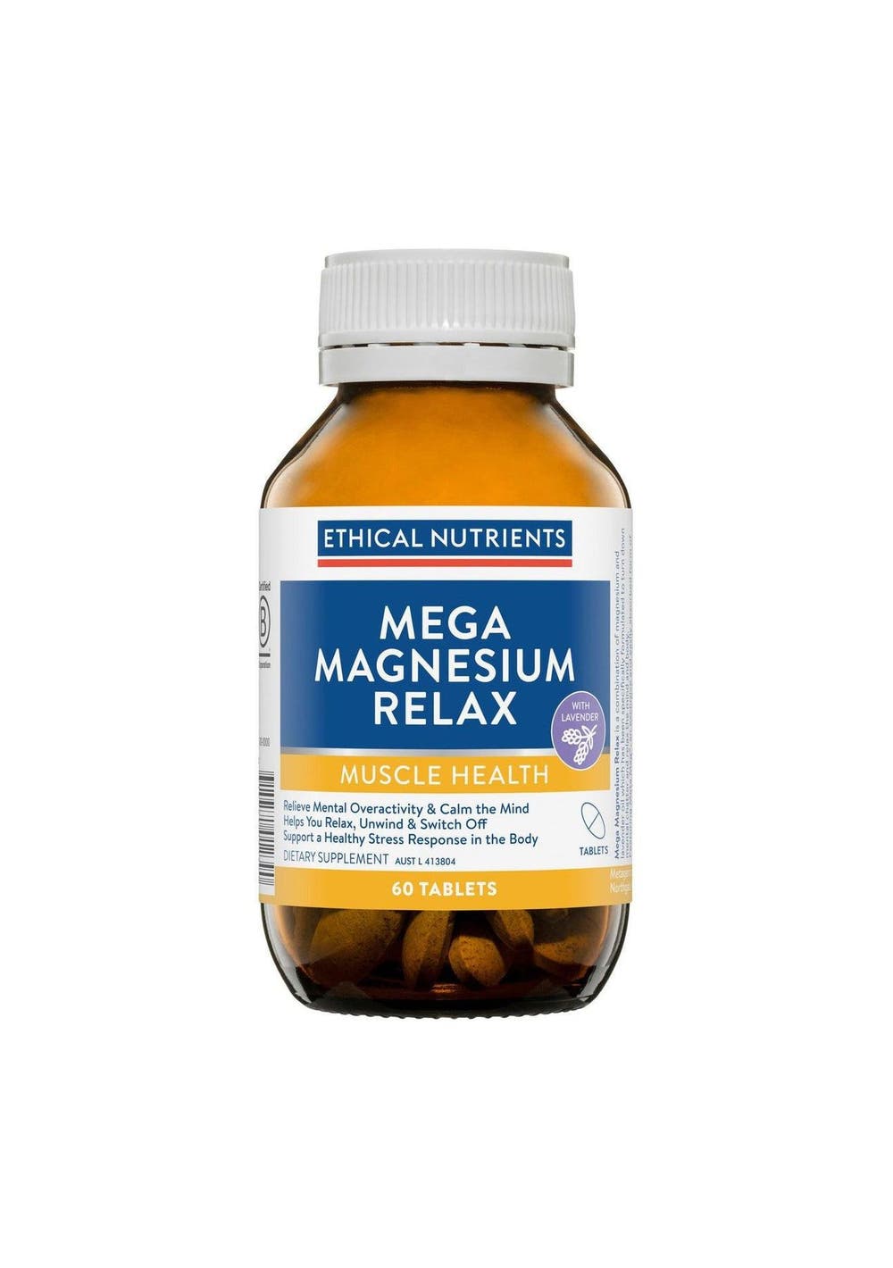 EXP:09/2025 Description Mega Magnesium Relax is a combination of magnesium and lavender oil which has been specifically formulated to turn down mental chatter and relax the mind and body. Featuring Meta Mag®, an exclusive and easily absorbed form of magnesium. Mega Magnesium Relax works to: Relieve symptoms of mild anxiety and stress* Relieve mental overactivity, irritability and restlessness Support mental clarity Help maintain emotional wellbeing Vegan friendly *In traditional Western herbal medicine. Ingredients Each Tablet Contains: Lavender Oil 40mg, Magnesium glycinate dihydrate (Meta Mag® - Magnesium diglycinate) 350mg, Equiv. Magnesium 35mg, Magnesium amino acid chelate 595mg, Equiv. Magnesium 125mg. Directions Adults: Take 1 tablet twice daily or as directed by a healthcare professional.