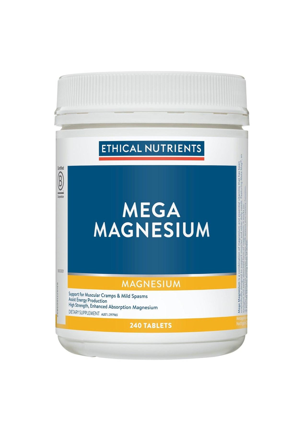 Description Ethical Nutrients Mega Magnesium provides support good muscle tone & function. Mega Magnesium has been scientifically designed to support muscles and other daily needs. Ethical Nutrients features MetaMag®, an exclusive and easily absorbed form of magnesium, and works to:- Provide support for muscle tone & healthy muscle function.- Supports tense and tight muscles. - Benefit during times of stress.- Supports muscle relaxation.- Support energy production.- Provide support during the premenstrual period. Ingredients Each tablet contains:Magnesium Amino Acid Chelate (Meta Mag- Magnesium Diglycinate) 500mg.Equiv. Elemental Magnesium 50mg.Magnesium Amino Acid Chelate 750mg.Equiv. Elemental Magnesium 150mg.Zinc Sulfate Monohydrate 19mg.Equiv. Elemental Zinc 7mg.Pyridoxine Hydrochloride (Vitamin B6) 16.6mg.Chromic Chloride Hexahydrate 1mg.Equiv. Elemental Chromium 200 microgram.Selenomethionine 33 microgram.Equiv. Elemental Selenium 13 microgram. Suggested Use For therapeutic applications of magnesium: Take 1 tablet three times daily.For daily magnesium supplementation: Take 1 tablet daily.Or take as directed by a healthcare professional. Additional Product Information Warnings If symptoms persist consult your healthcare professional. Vitamin supplements should not replace a balanced diet. This product contains selenium which is toxic in high doses. A daily dose of 150 micrograms for adults of selenium from dietary supplements should not be exceeded.Do not use if cap and/or bottle seals are missing or broken.