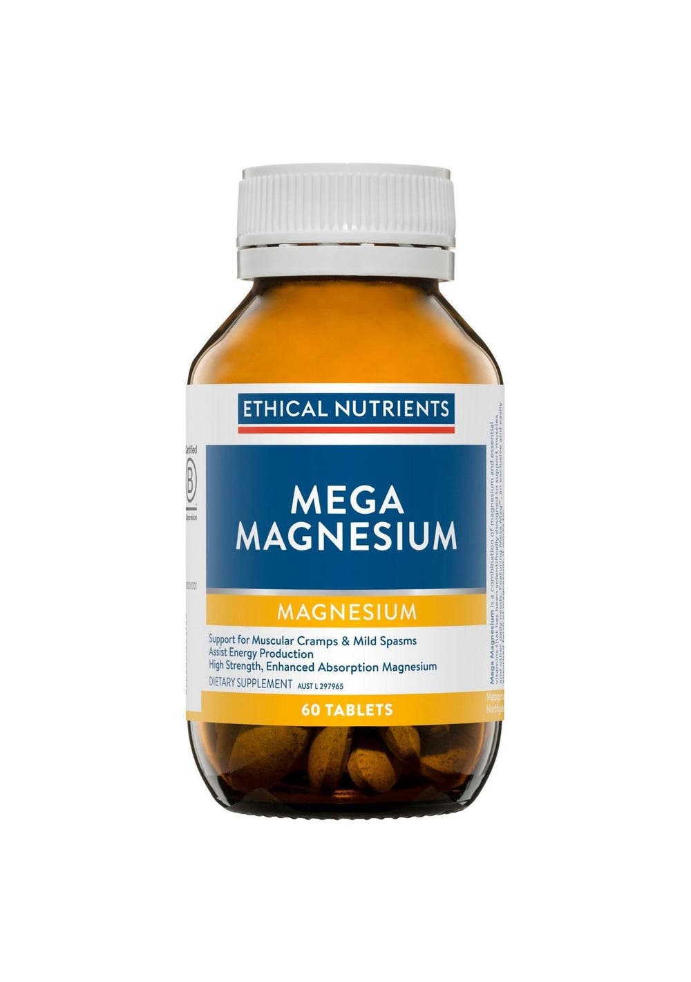Description Ethical Nutrients Mega Magnesium provides support good muscle tone & function. Mega Magnesium has been scientifically designed to support muscles and other daily needs. Ethical Nutrients features MetaMag®, an exclusive and easily absorbed form of magnesium, and works to:- Provide support for muscle tone & healthy muscle function.- Supports tense and tight muscles. - Benefit during times of stress.- Supports muscle relaxation.- Support energy production.- Provide support during the premenstrual period. Ingredients Each tablet contains:Magnesium Amino Acid Chelate (Meta Mag- Magnesium Diglycinate) 500mg.Equiv. Elemental Magnesium 50mg.Magnesium Amino Acid Chelate 750mg.Equiv. Elemental Magnesium 150mg.Zinc Sulfate Monohydrate 19mg.Equiv. Elemental Zinc 7mg.Pyridoxine Hydrochloride (Vitamin B6) 16.6mg.Chromic Chloride Hexahydrate 1mg.Equiv. Elemental Chromium 200 microgram.Selenomethionine 33 microgram.Equiv. Elemental Selenium 13 microgram. Suggested Use For therapeutic applications of magnesium: Take 1 tablet three times daily.For daily magnesium supplementation: Take 1 tablet daily.Or take as directed by a healthcare professional. Additional Product Information Warnings If symptoms persist consult your healthcare professional. Vitamin supplements should not replace a balanced diet. This product contains selenium which is toxic in high doses. A daily dose of 150 micrograms for adults of selenium from dietary supplements should not be exceeded.Do not use if cap and/or bottle seals are missing or broken.