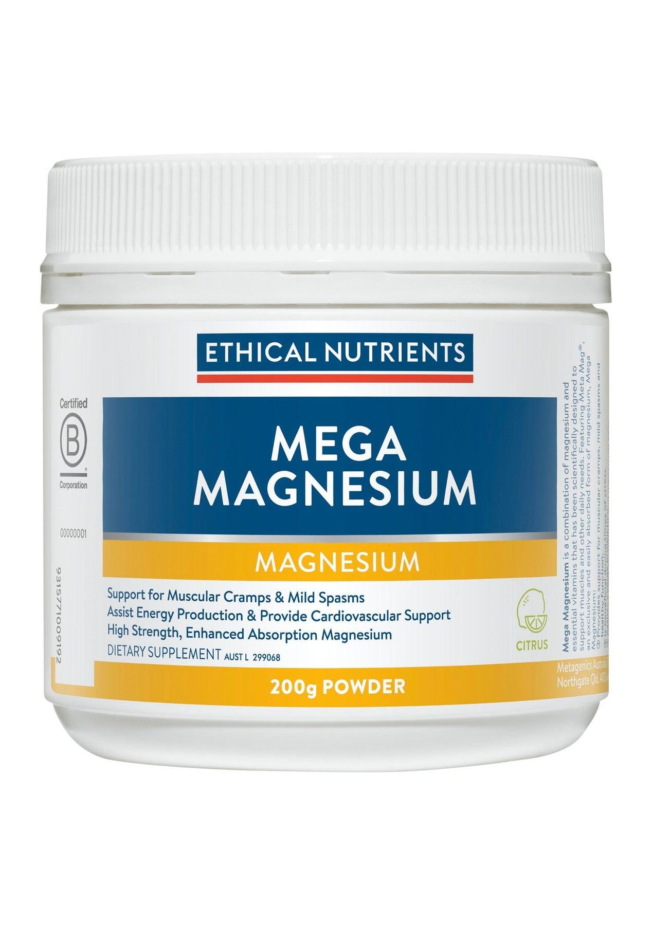 Description Ethical Nutrients Mega Magnesium Citrus supports muscular cramps & mild spasms. Mega Magnesium Citrus Powder is a combination of magnesium and essential vitamins that has been scientifically designed to support muscles and other daily needs. Featuring Meta Mag®, an exclusive and easily absorbed form of magnesium, and works to: - Support muscular cramps, mild spasms and healthy function.- Is beneficial during times of stress.- Assists energy production.- Relieves PMT symptoms and menstrual pain. Ingredients Each dose (8.7 g) contains:Magnesium Amino Acid Chelate (Meta Mag - Magnesium Diglycinate) 3g.Equiv. Elemental Magnesium 300mg.Taurine 3g. Ascorbic Acid (Vitamin C) 300mg.Calcium Hydrogen Phosphate Dihydrate 290mg.Equiv. Elemental Calcium 68mg.Monobasic Potassium Phosphate 182mg.Equiv. Elemental Potassium: 52mg.Pyridoxine Hydrochloride (Vitamin B6) 50mg. Suggested Use For therapeutic applications of magnesium:Add 1 scoop (8.7g) to 200mL of water twice daily. For daily magnesium supplementation:Add 1 scoop (8.7g) to 200mL of water once daily.Or take as directed by a healthcare professional. Additional Product Information Warnings If symptoms persist consult your healthcare professional. Vitamin supplements should not replace a balanced diet. Stop taking this medication if you experience tingling, burning or numbness and see your healthcare practitioner as soon as possible. [Contains vitamin B6]. Do not use if cap and/or bottle seals are missing or broken.