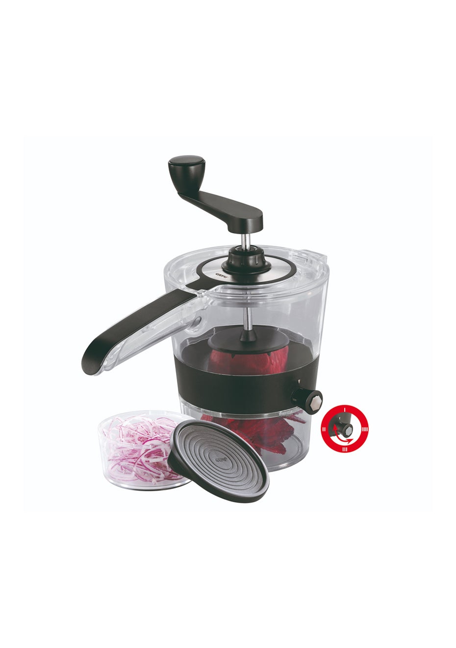 The ultimate spiral tool from GEFU of Germany Transforms vegetables into vegetable spaghetti Open the lid, set the adjusting wheel to desired width of cut and place the vegetables in, then simply turn the handle for long spirals with almost no scraps 4 different widths of cut for creative recipes; Spiral cut across the entire width of the material, 3mm, 6mm or 12mm wide adjustable via adjusting wheel Thickness of cut: 2.5mm Special blade steel Folding lid for easy filling Endless spiral produced by magic in no time at all Detachable non-slip holding container for safe standing Splash-guard lid with drive unit detachable for easy cleaning Use with closed lid only, max filling height 80mm