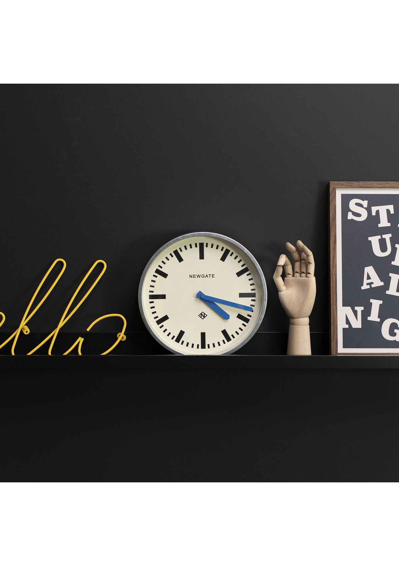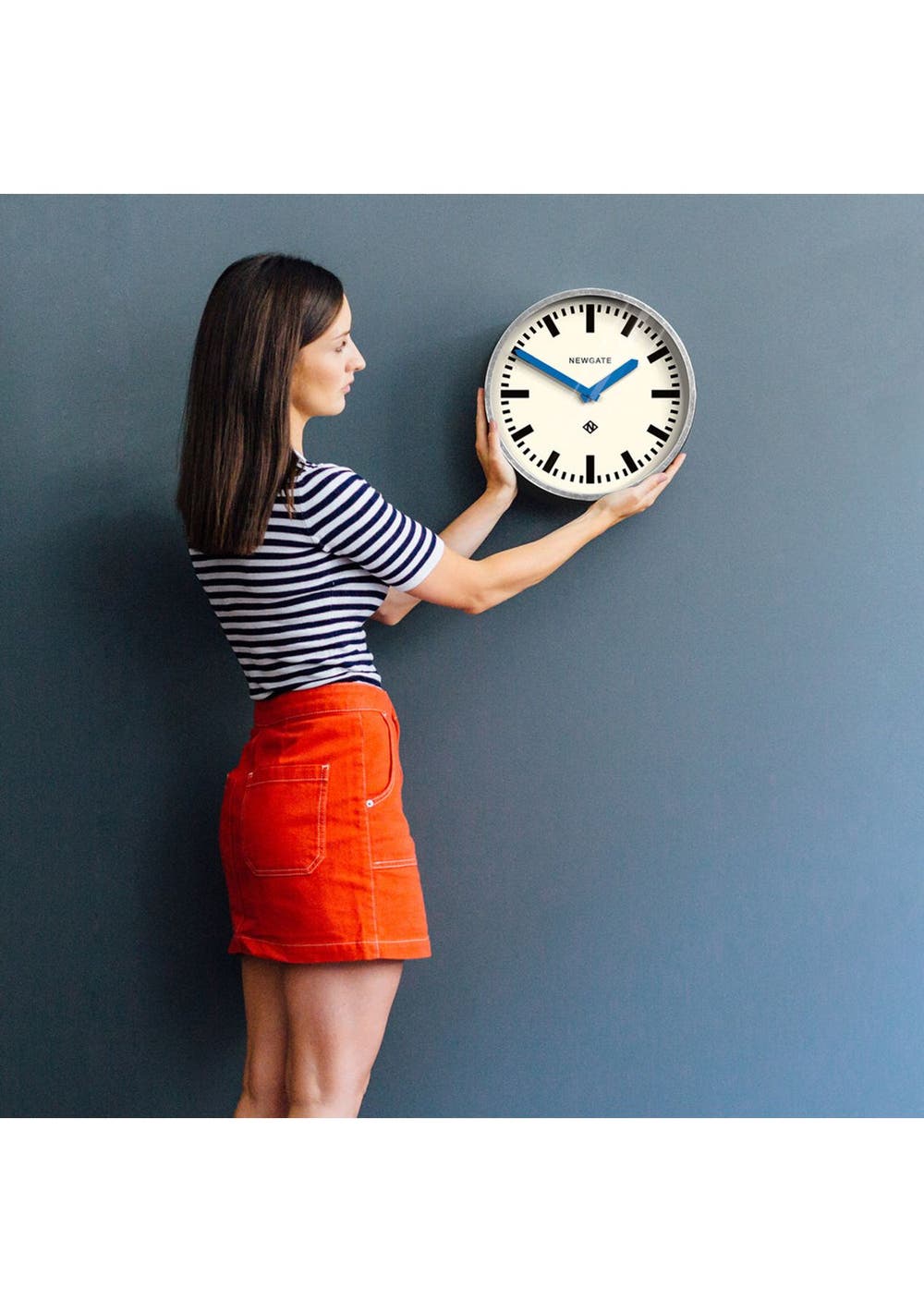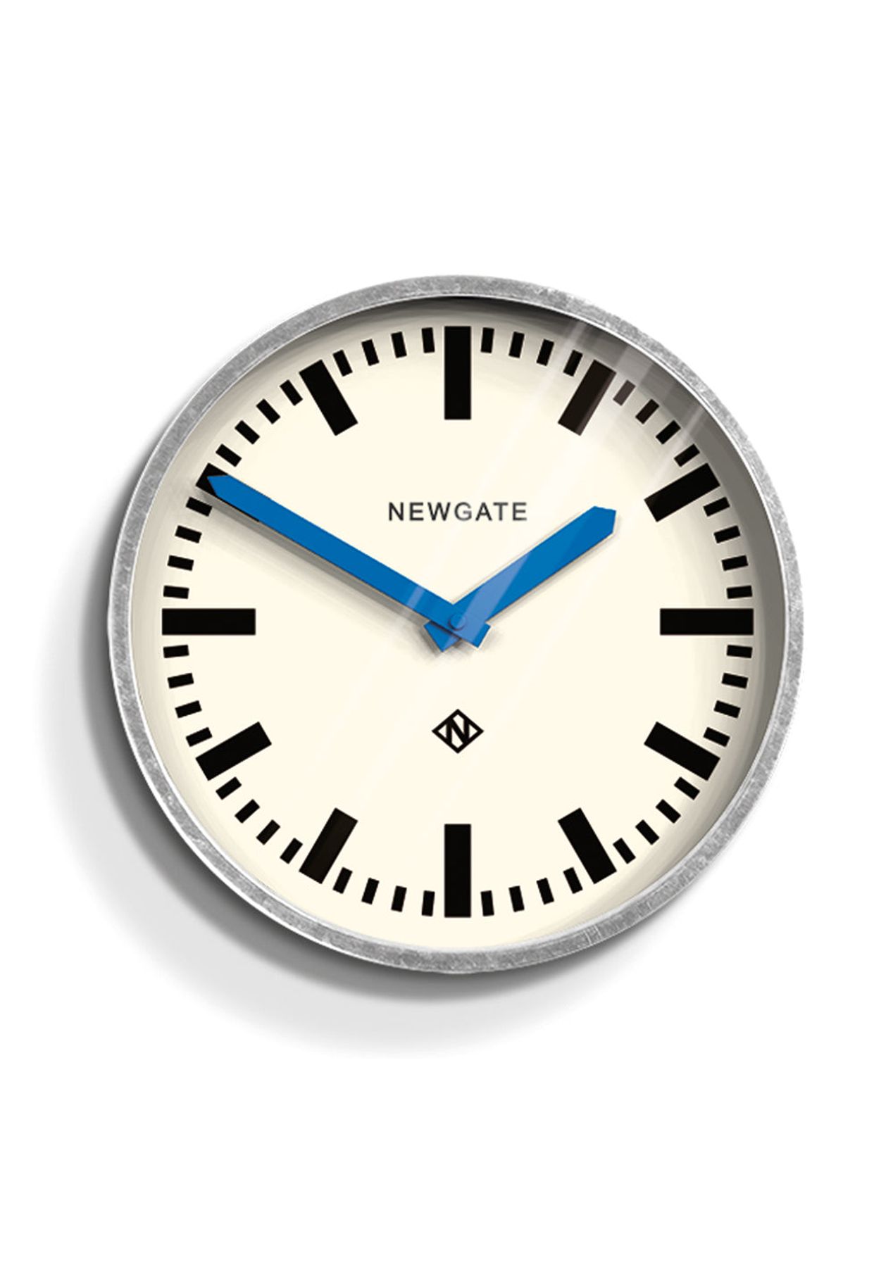 Newgate Luggage Wall Clock Galvanised Blue Hands An industrial galvanised metal wall clock with a modern marker dial and contemporary blue hands. One of Newgate's most iconic clock designs, the Luggage is inspired by the mid-Century railway station clocks that the brand's founders collected on their travels across Europe. An injection of Newgate's modern and contemporary style has seen the Luggage become a design classic. At home in an industrial, retro or minimalist interior, the Luggage wall clock creates a statement focal point in the kitchen, living room or office. - Material: Metal, Acrylic, Paper, Glass- Colour: Galvanised w/ Blue Hands- Movement: Quartz- Power: 1 x AA (Not Included)- Dimensions: LWH 7.3 x 30 x 30cm- Weight: 0.93kg