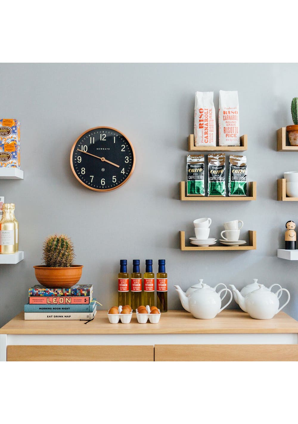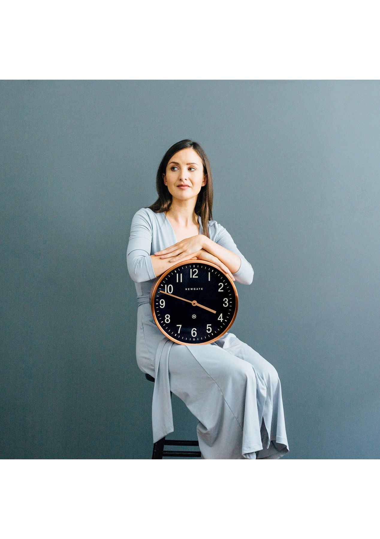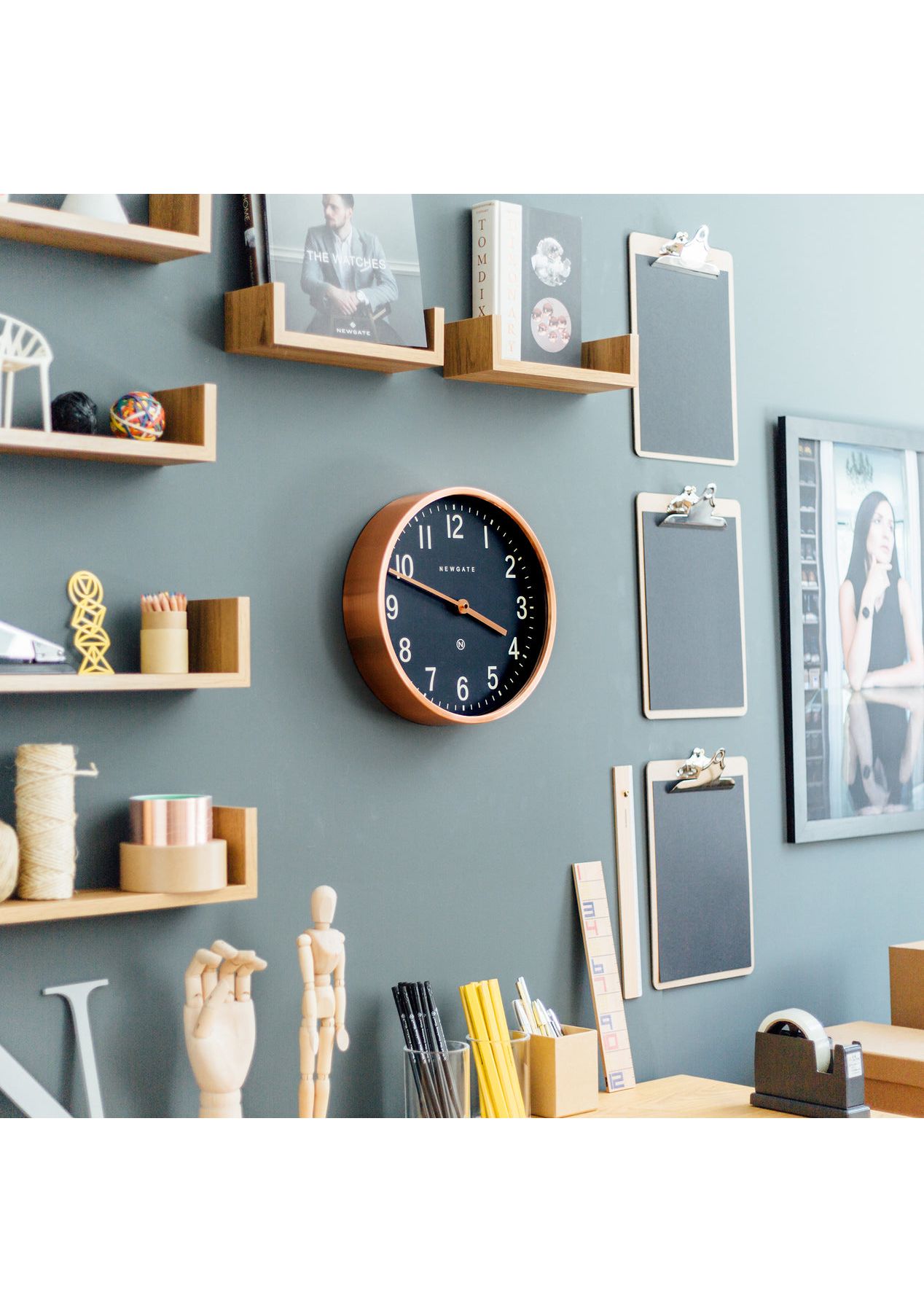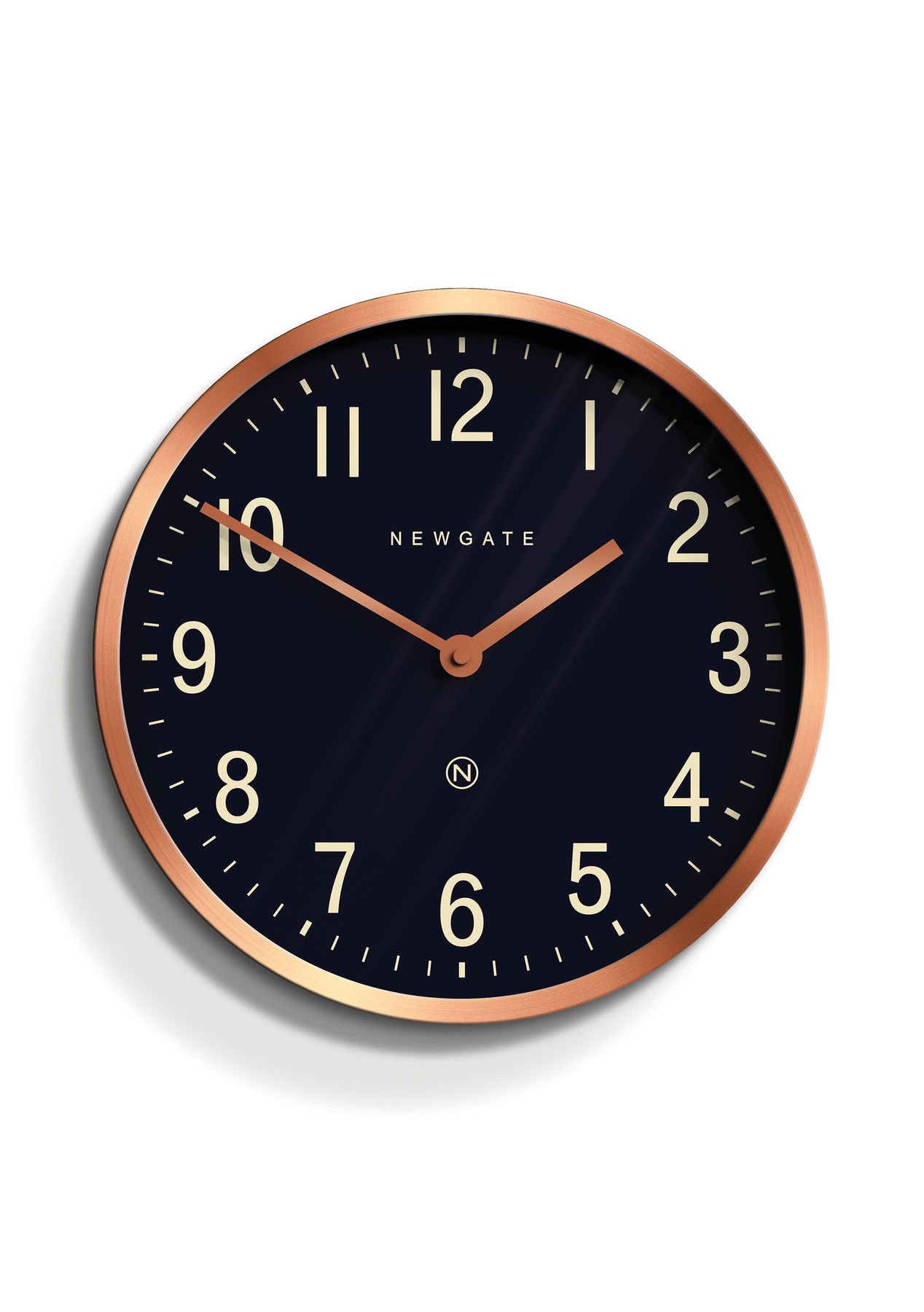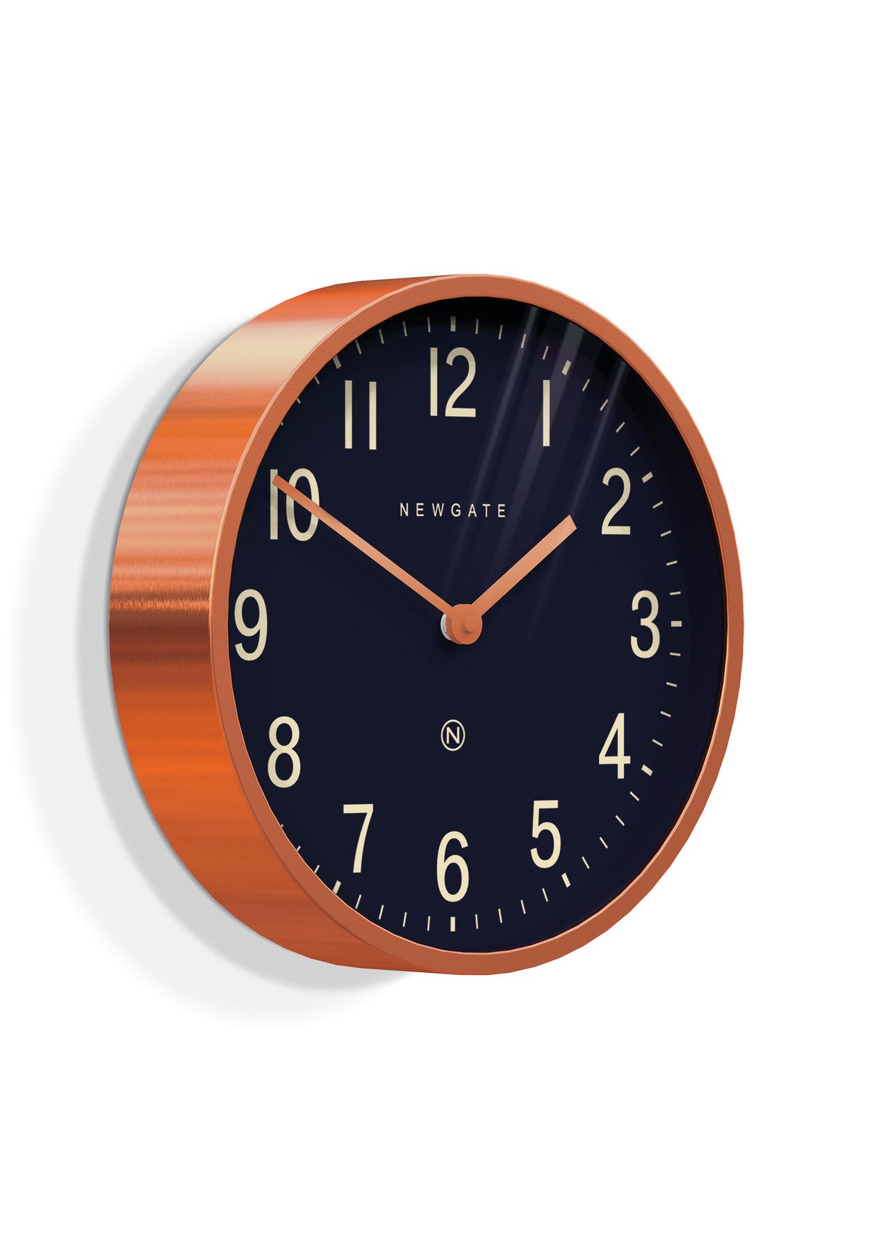Newgate Master Edwards Clock Radial Copper A small radial copper effect metal wall clock fusing mid-Century modern design with contemporary minimalist style. The deep straight-cut metal case with radial copper effect finish holds a bold petrol blue dial with copper-finish hands. - Material: Metal, Acrylic, Paper, Glass- Colour: Copper- Movement: Quartz 'Silent Sweep'- Power: 1 x AA (not included)- Dimensions: LWH 7.3 x 30 x 30cm- Weight: 0.93kg