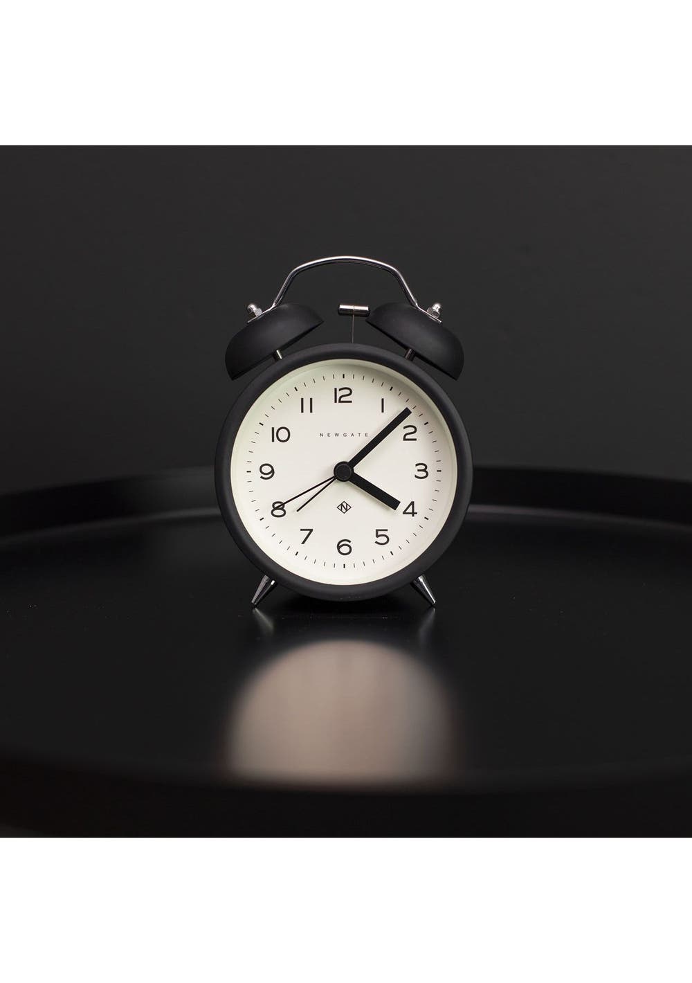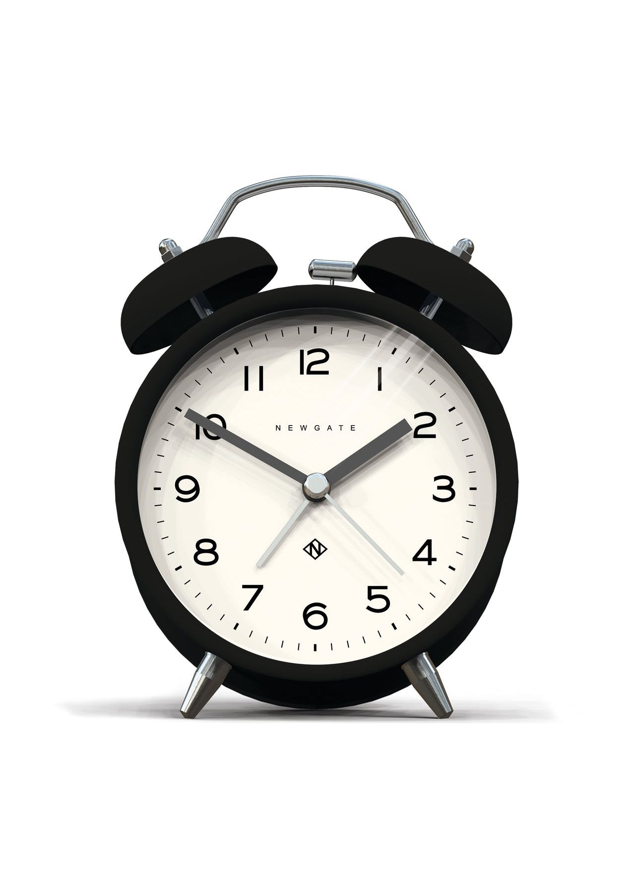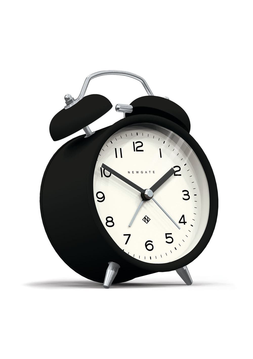Newgate Charlie Bell Echo Matte Black A modern alarm clock with a matt black finish, contemporary graphic dial and a moving hammer and twin-bell alarm. Known as silent sweep in the industry, the hands move in a constant sweeping motion rather than a stepped tick. So, you won't hear any ticking but if your hearing is particularly sensitive in a completely silent room you may hear a very quiet whirring. - Material: Metal, Acrylic, Paper, Glass- Colour: Black- Movement: Quartz- Power: 1 x AA (not included)- Dimensions: LWH 5.5 x 9.8 x 13.5cm- Weight: 0.22kg