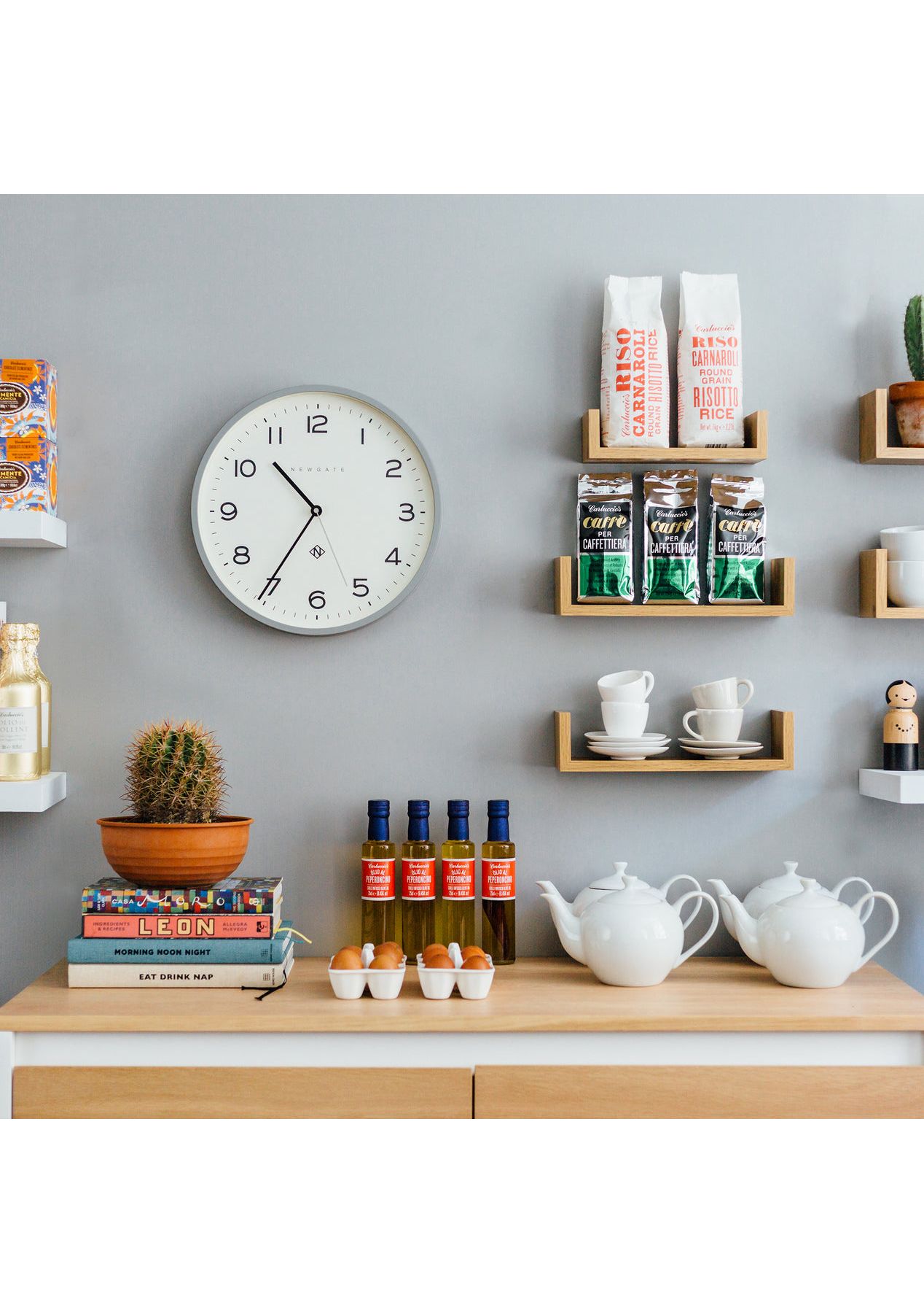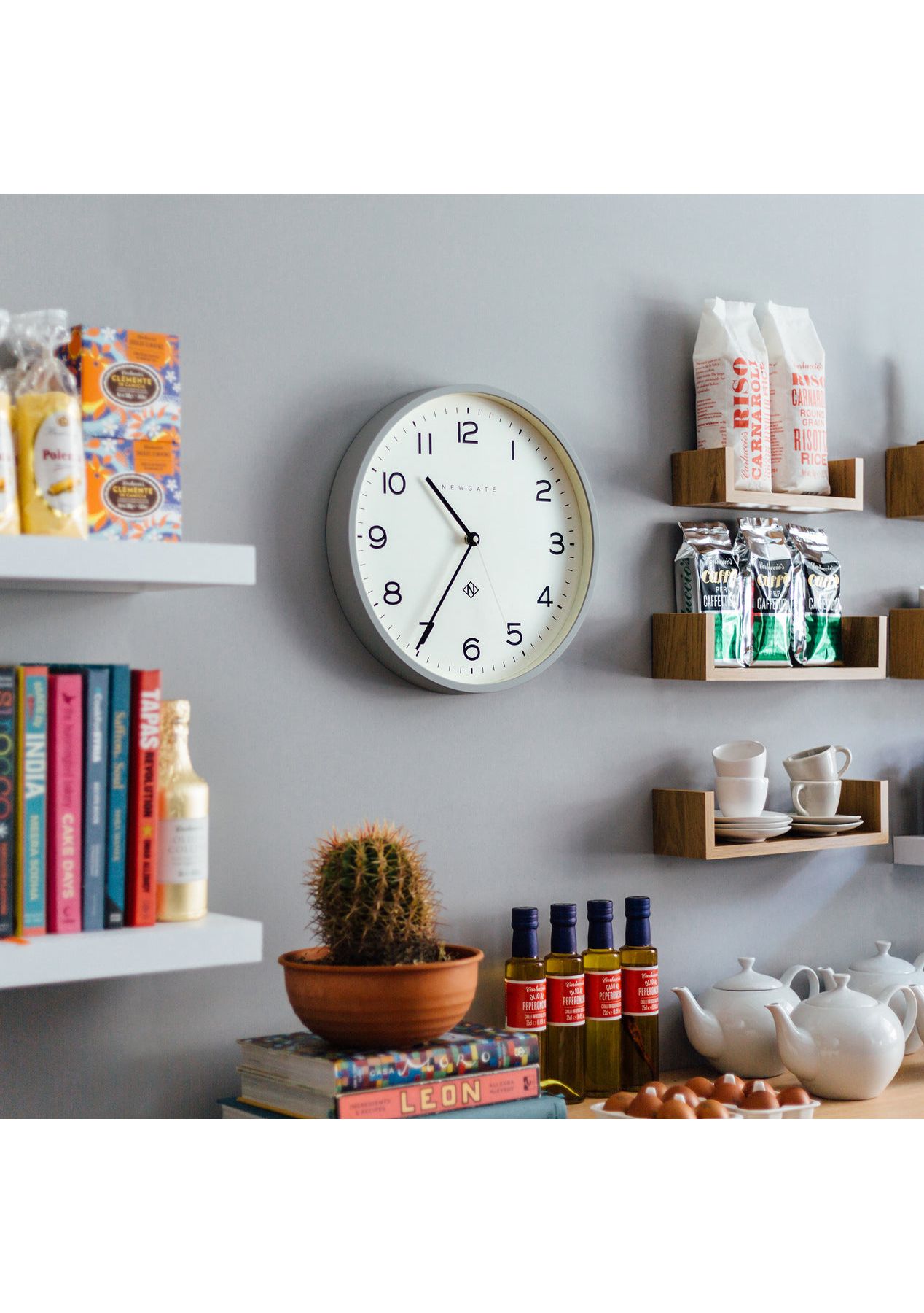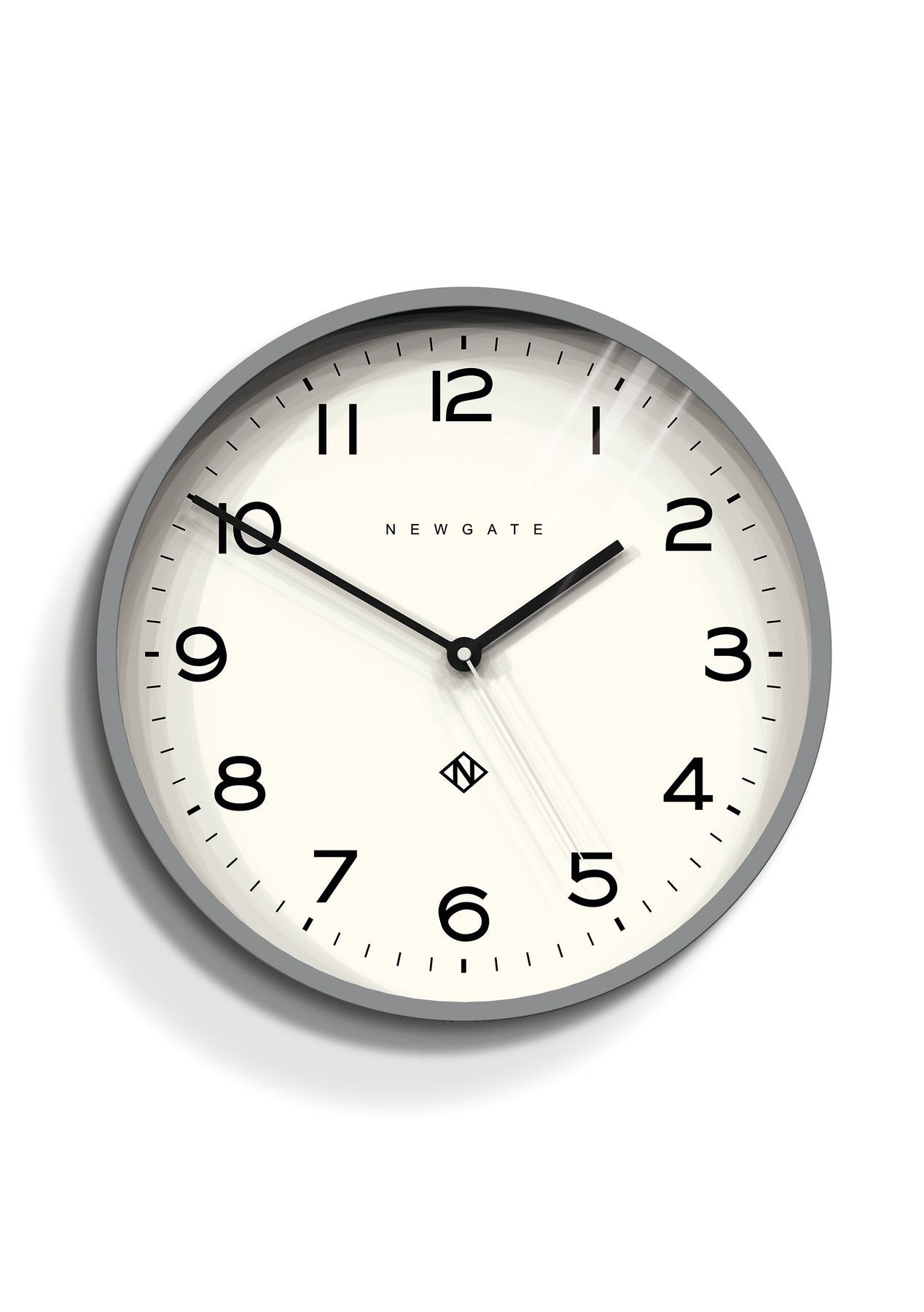 Newgate Number Three Echo Clock Silicone Grey A modern grey wall clock with a minimalist graphic dial and a contemporary straight-cut case. - Material: Acrylic, Paper, Metal Hands, Glass- Colour: Silicone Grey- Movement: Quartz. This is a ticking clock.- Power: 1 x AA (not included)- Dimensions: LWH 4.5 x 37.5 x 37.5cm; 1.03kg