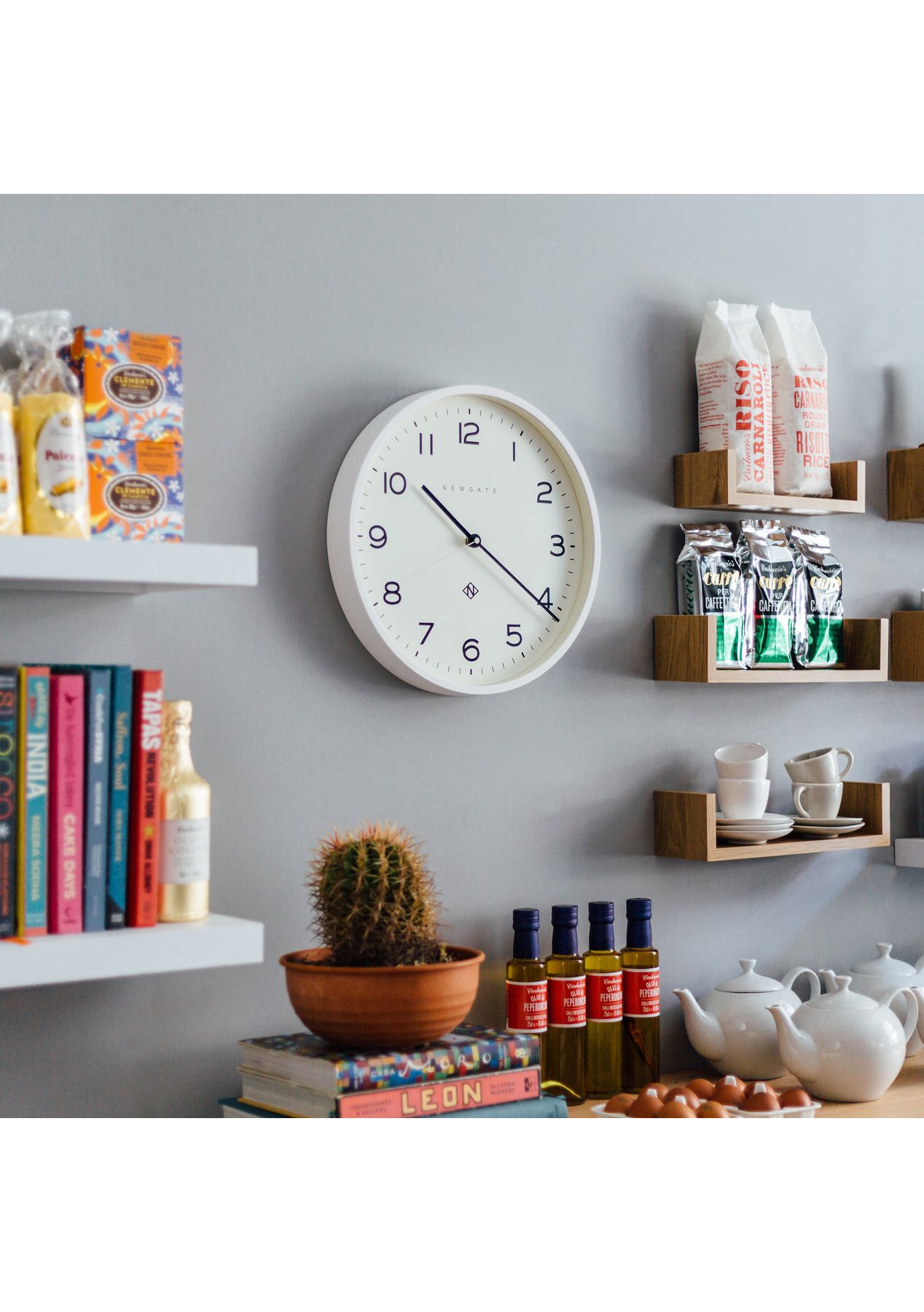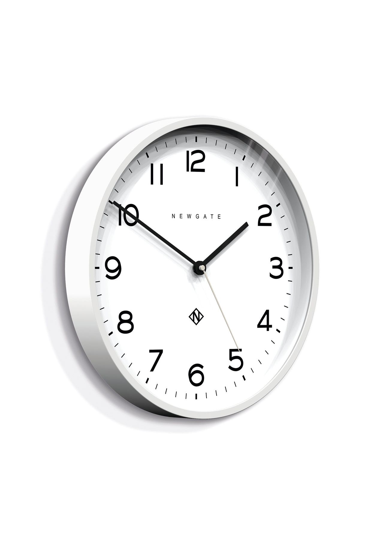 Newgate Number Three Echo Clock Silicone White A modern white wall clock with a minimalist graphic dial and a contemporary straight-cut case. - Material: Acrylic, Metal Hands, Glass- Colour: White- Movement: Quartz. This is a ticking clock.- Power: 1 x AA (not included)- Dimensions: LWH 4.5 x 37.5 x 37.5cm; 1.03kg