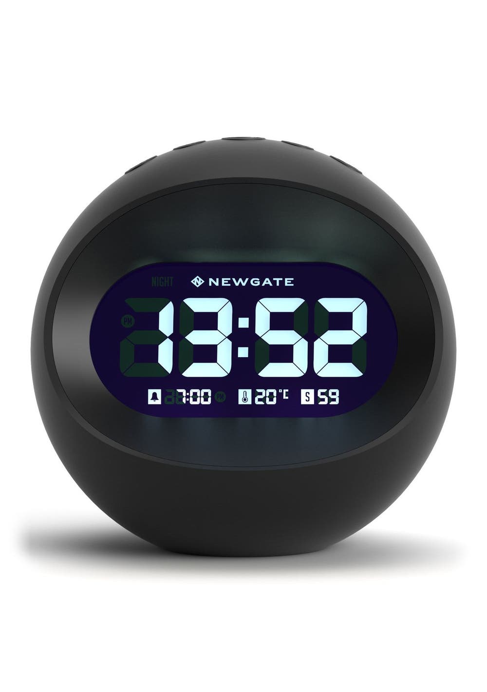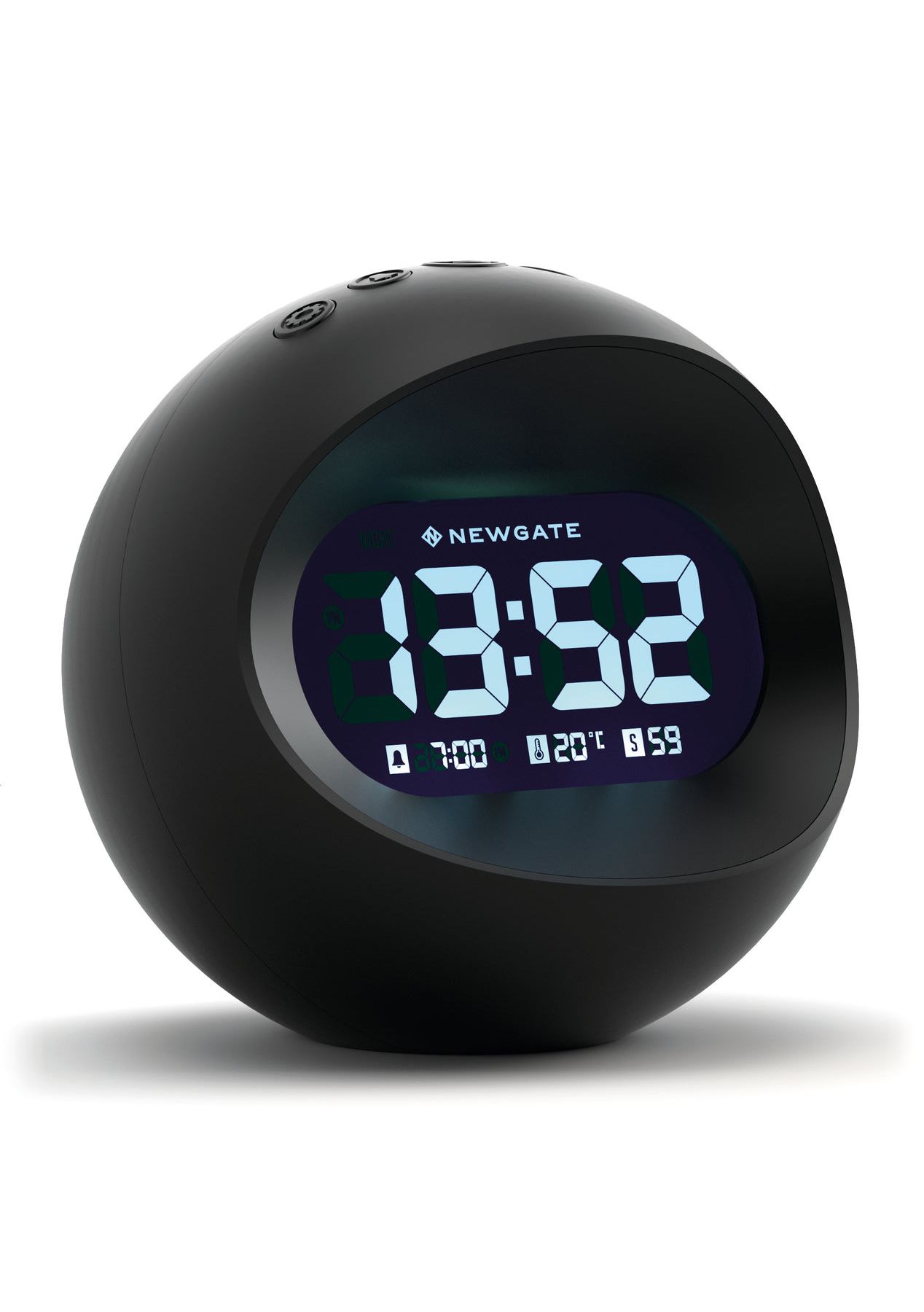 Newgate Centre Of The Earth Lcd Alarm Clock Black Spherical black LCD alarm clock with a sleek black multi-function screen that offers a modern yet retro addition to a room. The unique British designed alarm clock incorporates a 12 or 24 hour time display, a digital alarm and snooze function, and temperature display. The screen will be dimmer when running on batteries alone, but bright when you hit the button on top, unless you have the USB cable connected in which case the screen will be really bright. - 12 or 24 hour format- LCD screen- Alarm and snooze function- Temperature display 0-37C- Night screen brightness setting- USB power cable included - Material: Acrylic case, Black LCD screen- Colour: Black - Movement: Digital- Power: Connect to DC or 3 x AAA (not included)- Dimensions: LWH 10.5 x 11.5 x 11cm- Weight: 0.20kg
