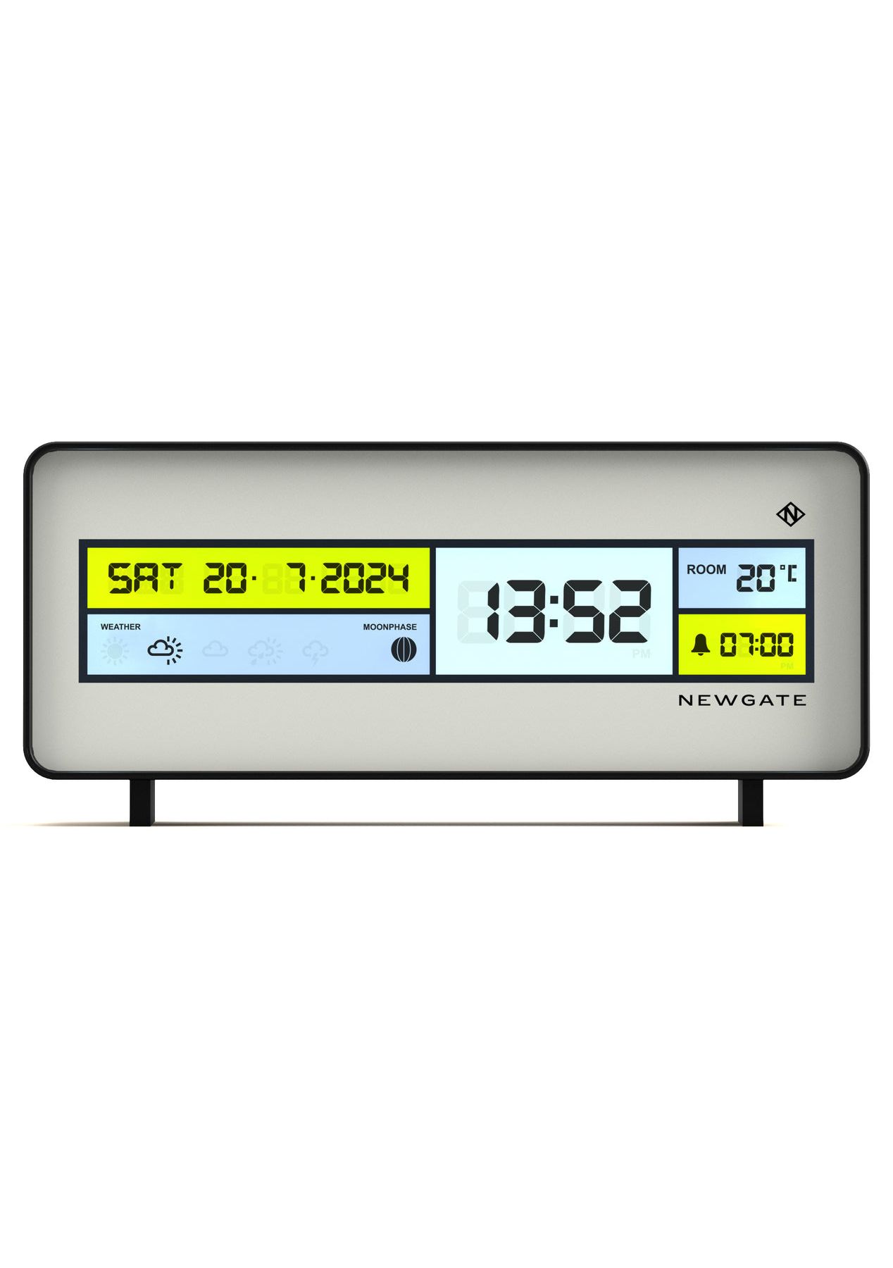 Newgate Futurama Lcd Alarm Clock Black Case White Lens A rectangular LCD alarm clock with a multi-function screen in a stylish colourway to give it an on-trend, minimalist style. The unusual alarm clock design incorporates a 12 or 24 hour time display, a digital alarm with a white border, snooze function and temperature display. The display will only be backlit continuously when connected to a power source with the included USB cable or a DC adaptor (not included). 3 x AAA batteries (not included) are required to retain time and alarm settings. - 12 or 24 hour format- Acrylic alarm clock- LCD screen- Alarm and snooze function- Temperature display- Moon Phase display- Date and day display- USB power cable included- Material: Acrylic case, White border LCD screen- Colour: Black w/ White- Movement: Digital- Power: Connect to DC or 3 x AAA (not included)- Dimensions: LWH 5.7 x 20 x 9.1cm- Weight: 0.28kg