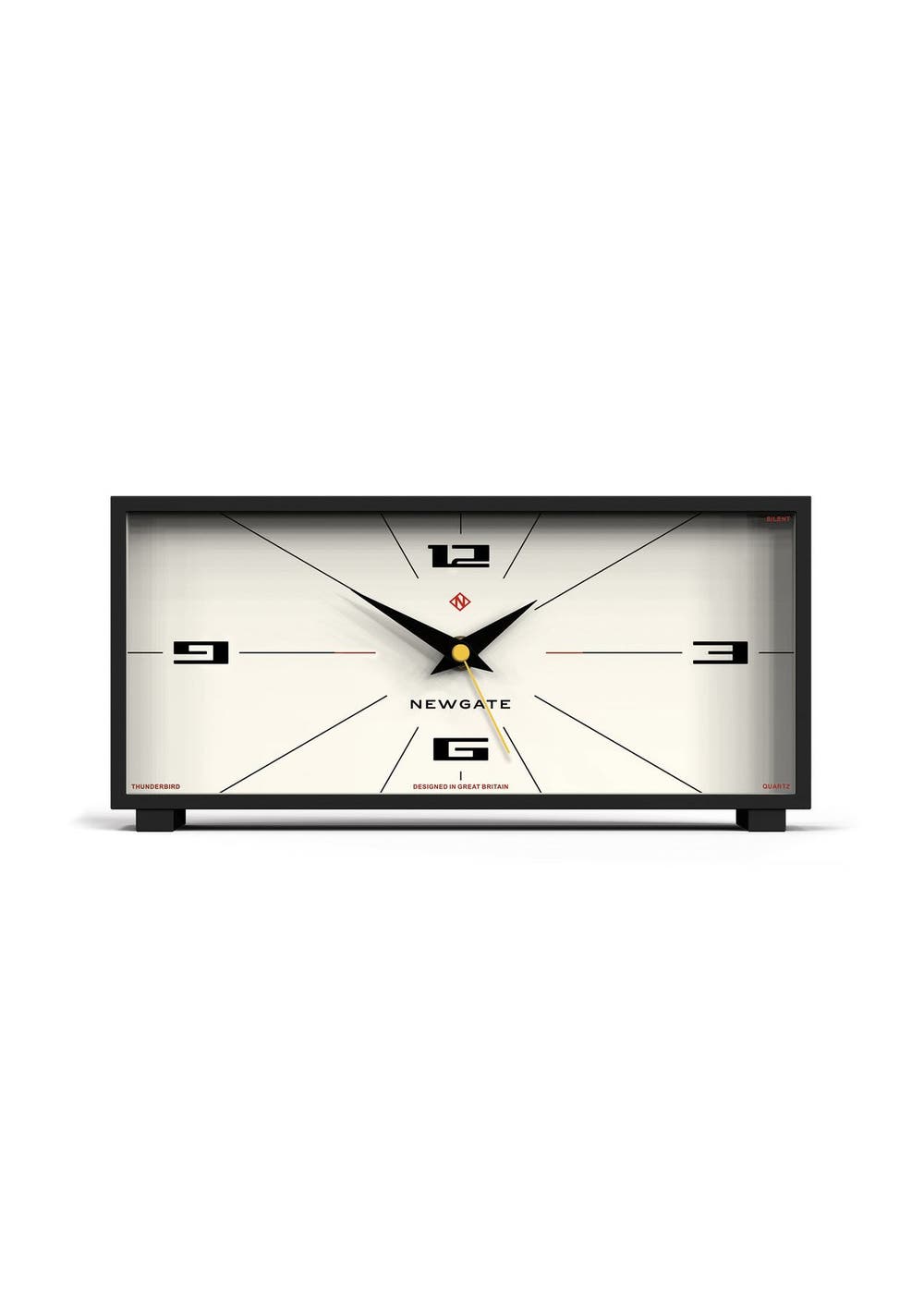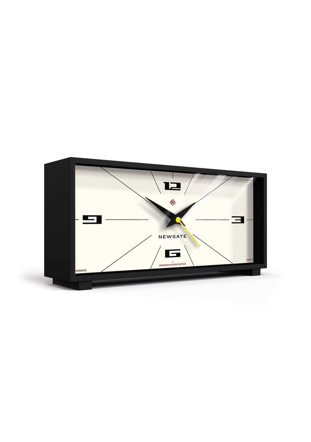 Newgate Thunderbird Mantel Clock Neutral Rocket Dial A mid-century modern mantel clock with an emphasis on the modern. This space-age design blends a contemporary cream face and matt black silicone case with a retro-inspired dial and simplified numerals. Known as silent sweep in the industry, the hands move in a constant sweeping motion rather than a stepped tick. So you won't hear any ticking but if your hearing is particularly sensitive in a completely silent room you may hear a very quiet whirring. - Material: Acrylic, Metal Hands, Glass- Colour: Black w/ White- Movement: Quartz- Power: 1 x AA (not included)- Dimensions: LWH 7.5 x 28 x 13.5cm; 0.63kg