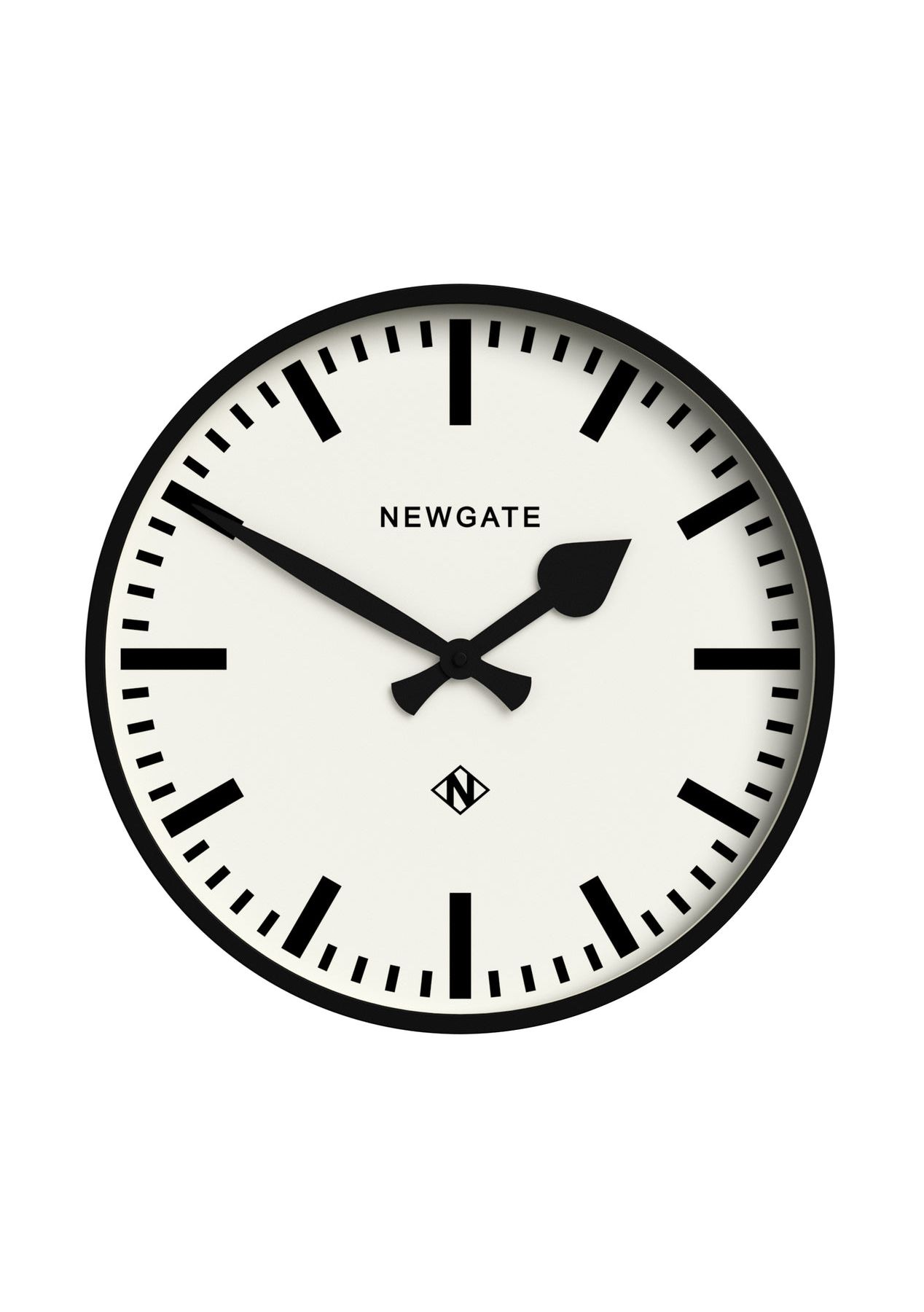Newgate Railway Clock Black A matt black station wall clock with a bold marker dial, black spade and batton hands and a minimalist straight-cut case. This bold wall clock is the ideal way to brighten up a room, whether that's the kitchen, living room or office. - Material: Acrylic, Paper, Metal Hands, Glass- Colour: Black- Movement: Quartz- Power: 1 x AA (not included)- Dimensions: LWH 4.5 x 37.5 x 37.5cm; 1.03kg