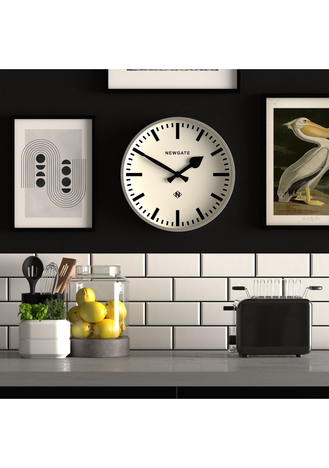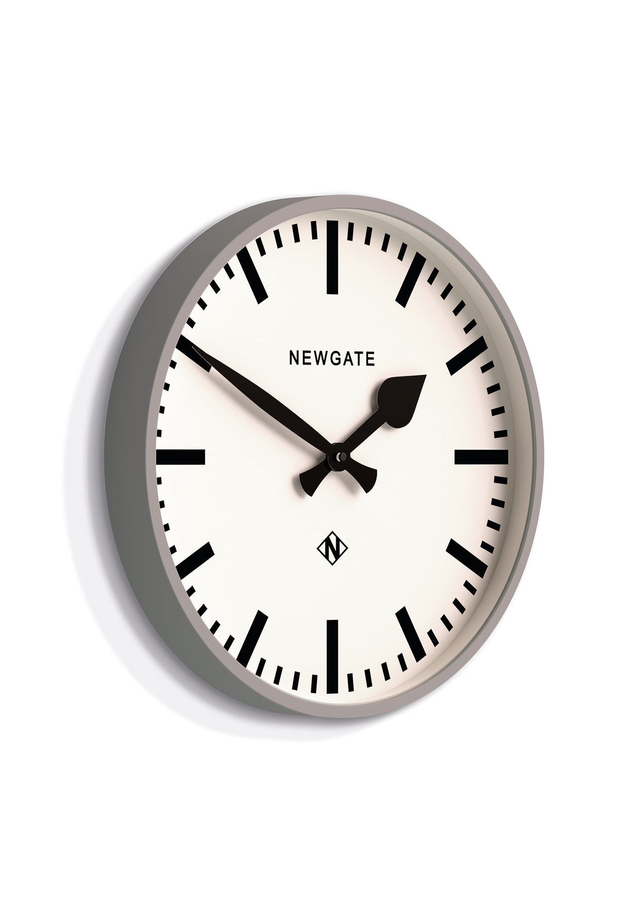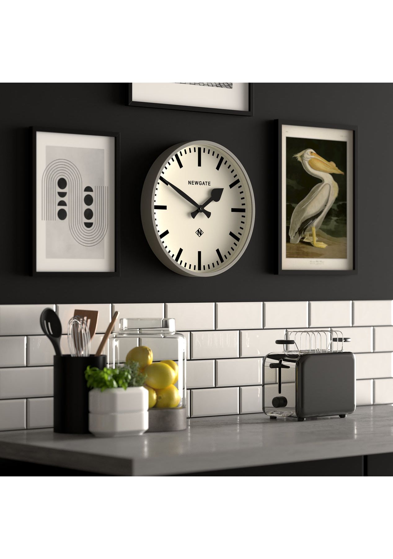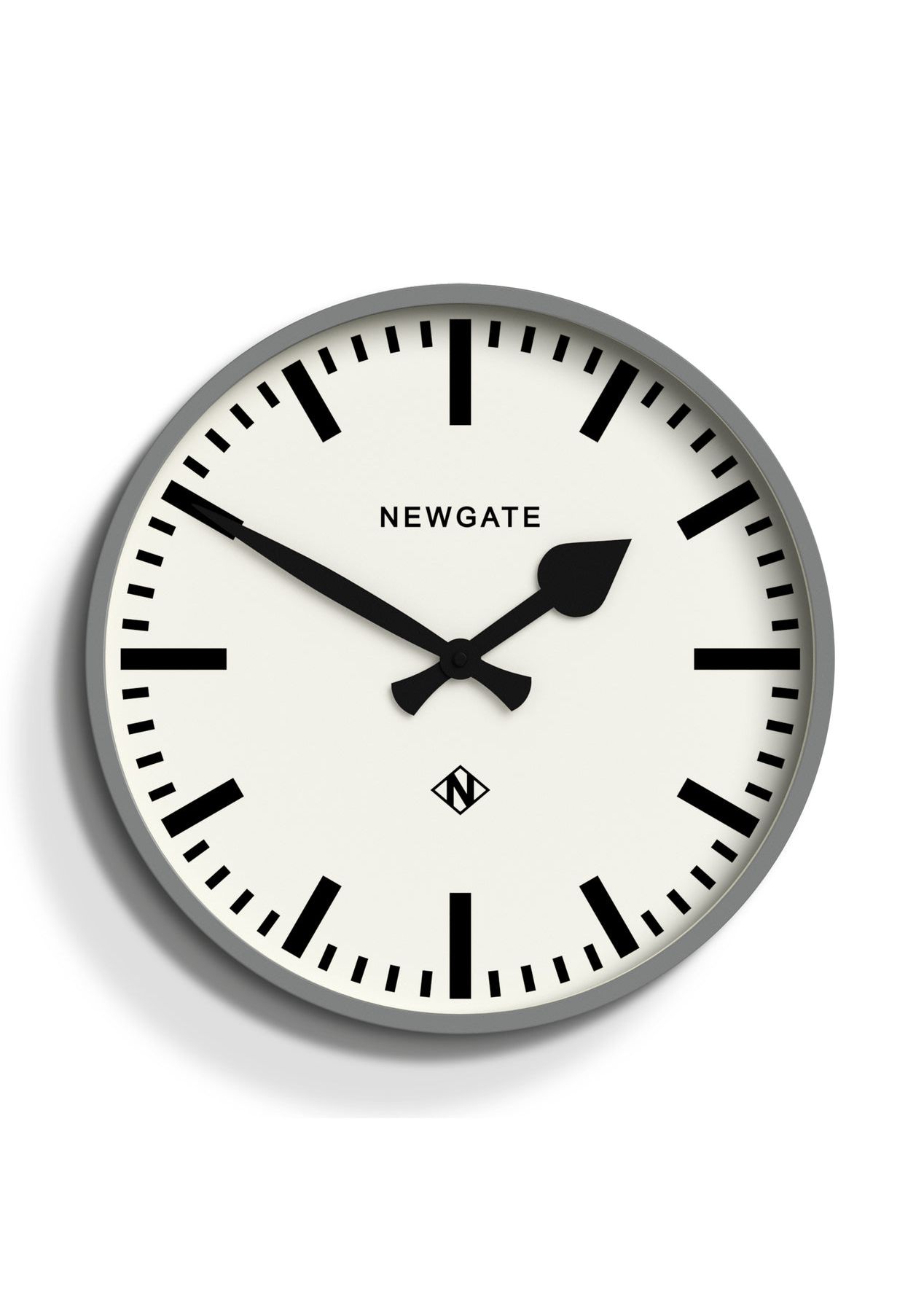 Newgate Railway Clock Grey A neutral grey station wall clock with a bold marker dial, black spade and batton hands and a minimalist straight-cut case. A neutral wall clock is the ideal way to add style to a room, whether that's the kitchen, living room or office. - Material: Acrylic, Paper, Metal Hands, Glass- Colour: Grey- Movement: Quartz- Power: 1 x AA (not included)- Dimensions: LWH 4.5 x 37.5 x 37.5cm; 1.03kg