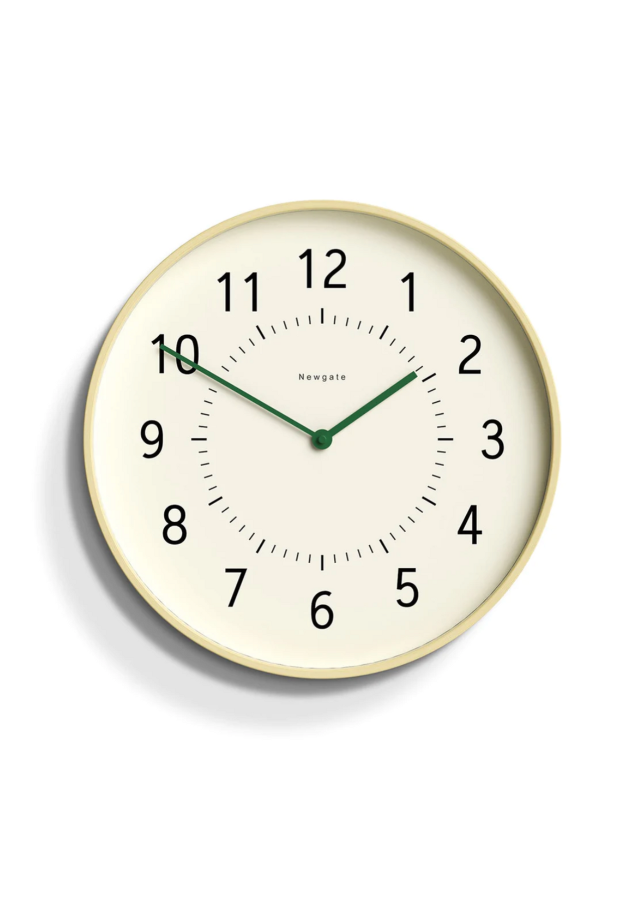 Newgate Monopoly Plywood Wall Clock With Green Hands A Scandi wall clock with a modern pale plywood case and a minimalist graphic dial, with colourful green hands. Ideal within a contemporary interior this large wood wall clock creates a modern focal point in the kitchen, living room or office. Please note, this clock is made from real wood so there may be slight variations in the colour and grain as well as some natural wood knots, lines and joins. - Material: Plywood, Acrylic, Paper, Metal hands, Glass- Colour: Plywood w/ Green Hands - Movement: Quartz 'Silent Sweep'- Power: 1 x AA (not included)- Dimensions: LWH 4.5 x 40.5 x 40.5cm- Weight: 1.28kg