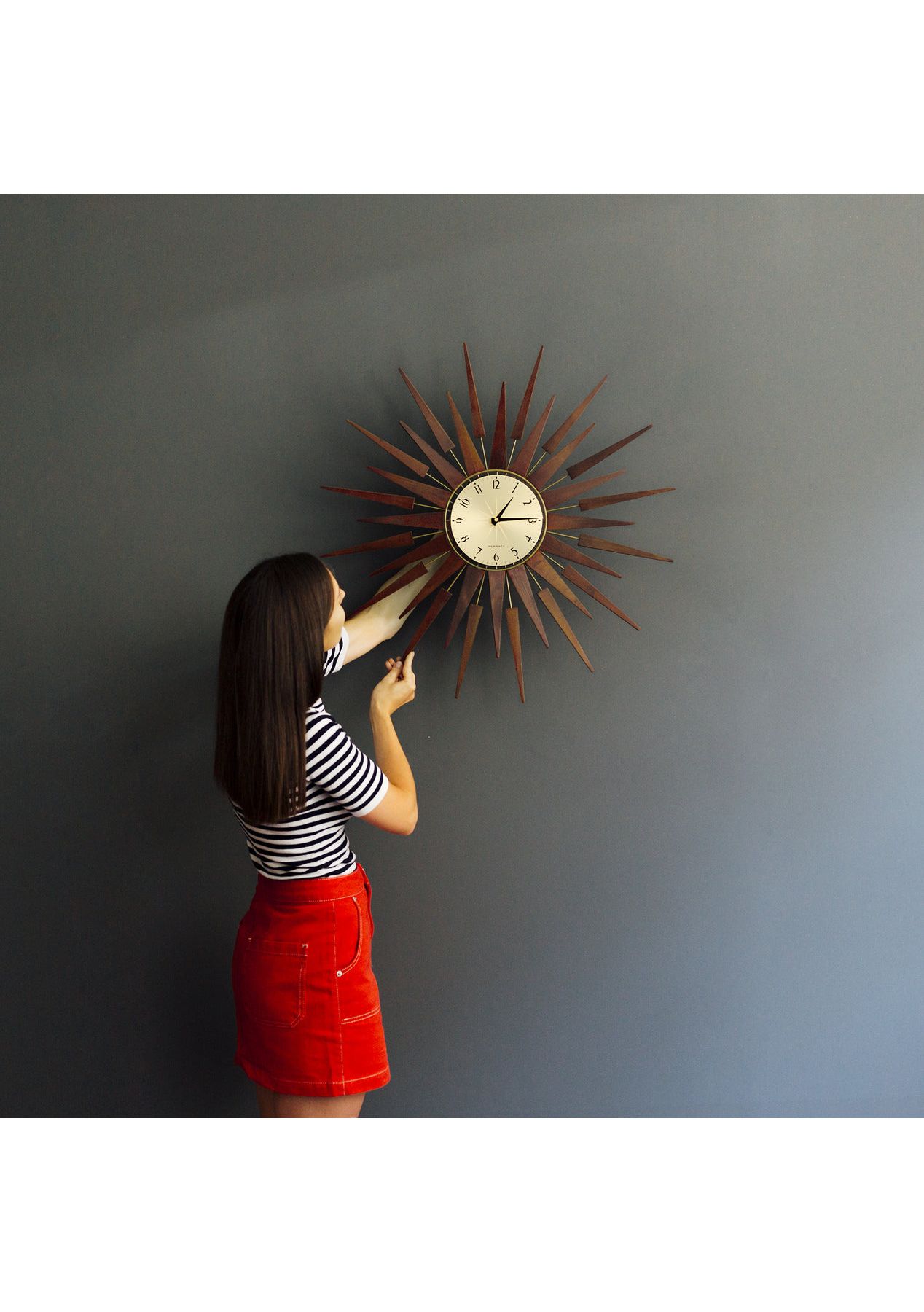 Newgate Pluto Clock A large retro mid-Century inspired sunburst wall clock with handmade real wood sunrays and a vintage-style spun brass effect dial. Ideal in a retro setting, the starburst Pluto wall clock creates a statement focal point in a room, whether that's the kitchen, living room or office. Please note, this clock is made from real wood so there may be slight variations in the colour and grain as well as some natural wood knots, lines and joins. - Material: Oak, Metal- Colour: Dark Oak- Movement: Quartz- Power: 1 x AA (not included)- Dimensions: LWH 4 x 66.5 x 66.5cm; 0.88kg