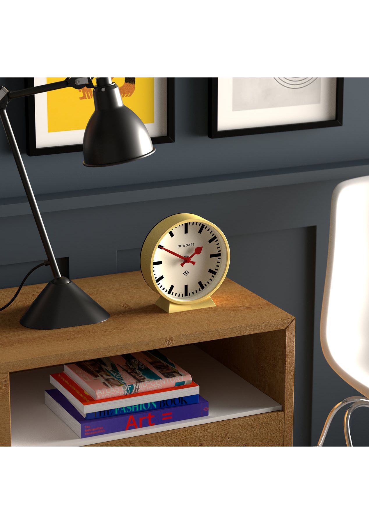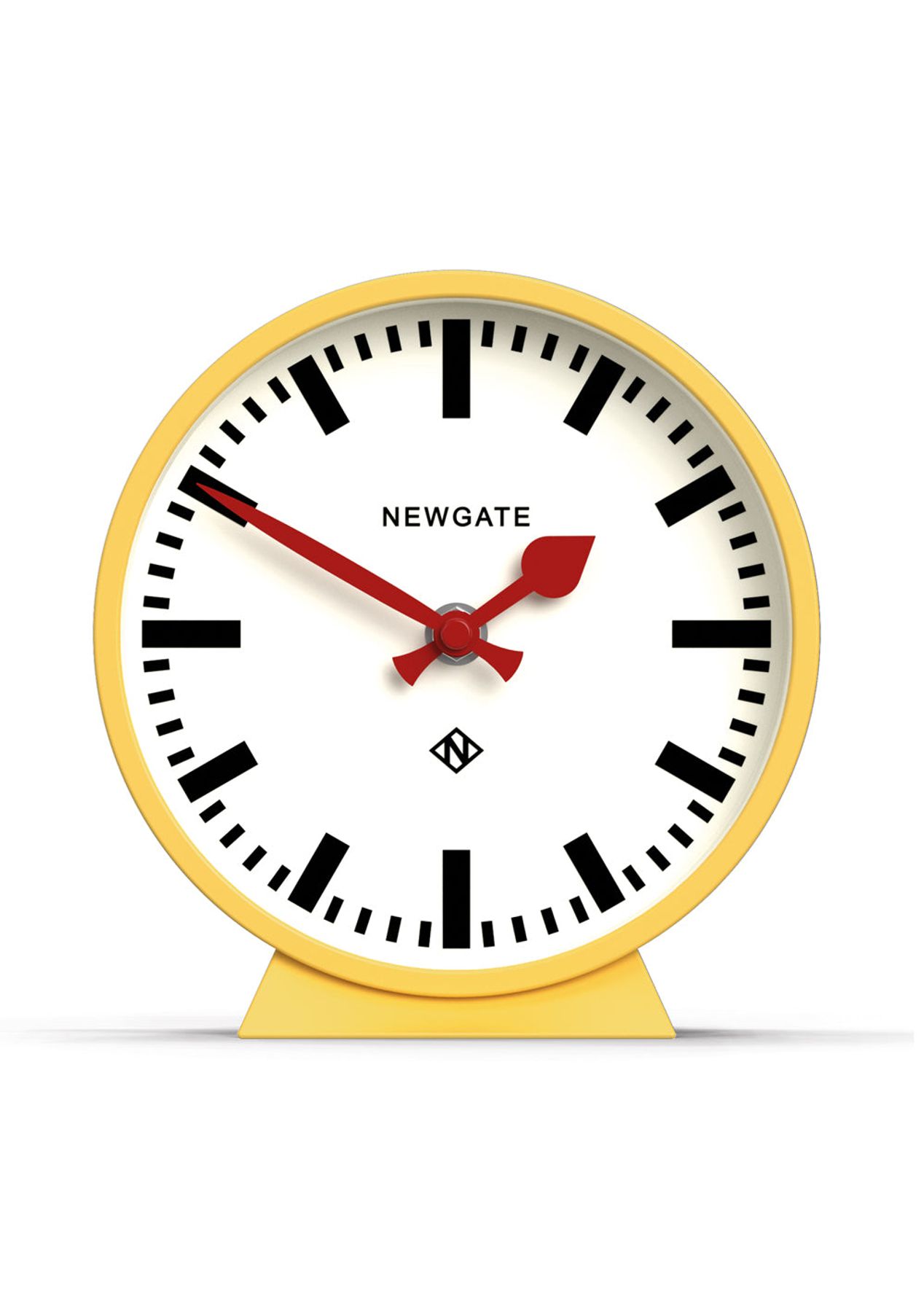 Newgate Railway Mantel Clock Cheeky Yellow A station style mantel clock with a bold marker dial, red spade and baton hands in a colourful bright yellow finish. Known as silent sweep in the industry, the hands move in a constant sweeping motion rather than a stepped tick. So you won't hear any ticking but if your hearing is particularly sensitive in a completely silent room you may hear a very quiet whirring. - Material: Acrylic, Metal, Glass- Colour: Yellow- Movement: Quartz 'Silent Sweep'- Power: 1 x AA (not included)- Dimensions: LWH 6 x 16 x 17cm; 0.27kg