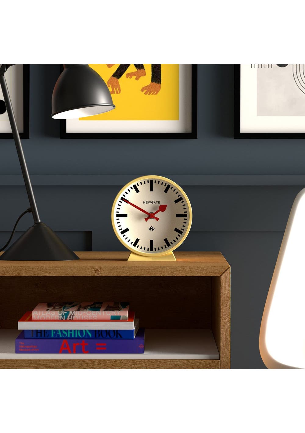 Newgate Railway Mantel Clock Cheeky Yellow A station style mantel clock with a bold marker dial, red spade and baton hands in a colourful bright yellow finish. Known as silent sweep in the industry, the hands move in a constant sweeping motion rather than a stepped tick. So you won't hear any ticking but if your hearing is particularly sensitive in a completely silent room you may hear a very quiet whirring. - Material: Acrylic, Metal, Glass- Colour: Yellow- Movement: Quartz 'Silent Sweep'- Power: 1 x AA (not included)- Dimensions: LWH 6 x 16 x 17cm; 0.27kg