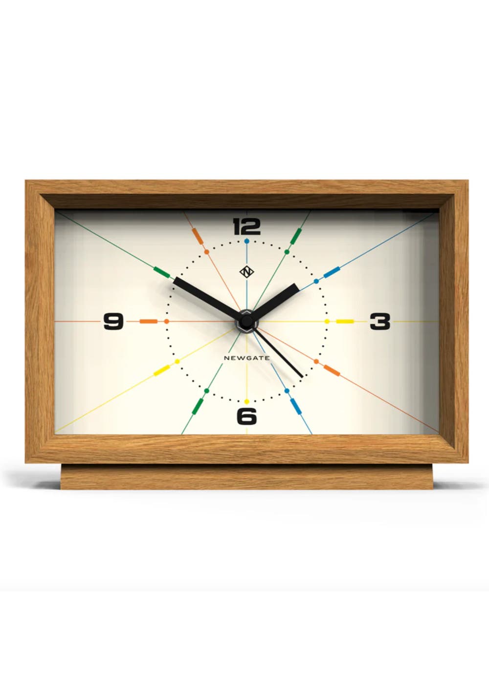 Newgate Hollywood Hills Mantel Clock A contemporary wooden mantel clock crafted from solid light oak. The graphic modernist dial features screen printed multicolour hour markers measured by metal conductor's baton hands. Known as silent sweep in the industry, the hands move in a constant sweeping motion rather than a stepped tick. So you won't hear any ticking but if your hearing is particularly sensitive in a completely silent room you may hear a very quiet whirring. Please note, this clock is made from real wood so there may be slight variations in the colour and grain as well as some natural wood knots, lines and joins. - Material: Oak, Acrylic, Paper, Metal hands, Glass- Colour: Light Oak- Movement: Quartz - Power: 1 x AA- Dimensions: LWH 8.5 x 25 x 17.5cm- Weight: 1.05kg