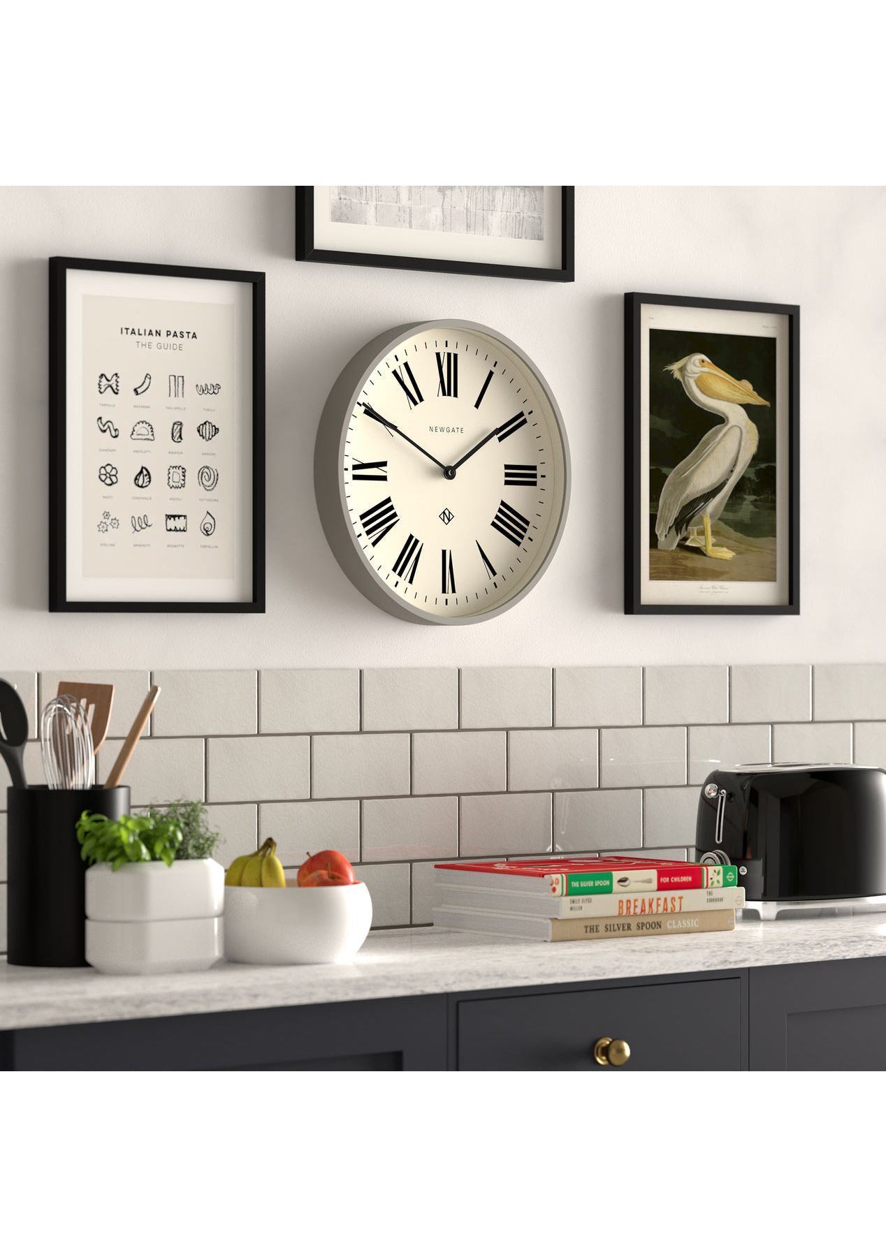 Newgate Number Three Italian Grey A Roman numeral wall clock with a modern matt grey finish. The Italian combines contemporary style with a classic Roman numeral dial to create a timeless look suited to any interior. A wall clock is the perfect way to create a focal point within a room, adding style to the interior as well as being a practical addition to the home. Designed in Britain, our wall clock collection makes the ideal addition to the kitchen, living room, hallway or office. - Size: HWD 37 x 37 x 4.6cm; 2kg- Materials: Acrylic case with a matt finish, metal hands and glass lens- Colour: Matt grey- Movement: Quartz. This is a ticking clock. - Power: Requires 1 x high quality branded alkaline AA battery (not included)