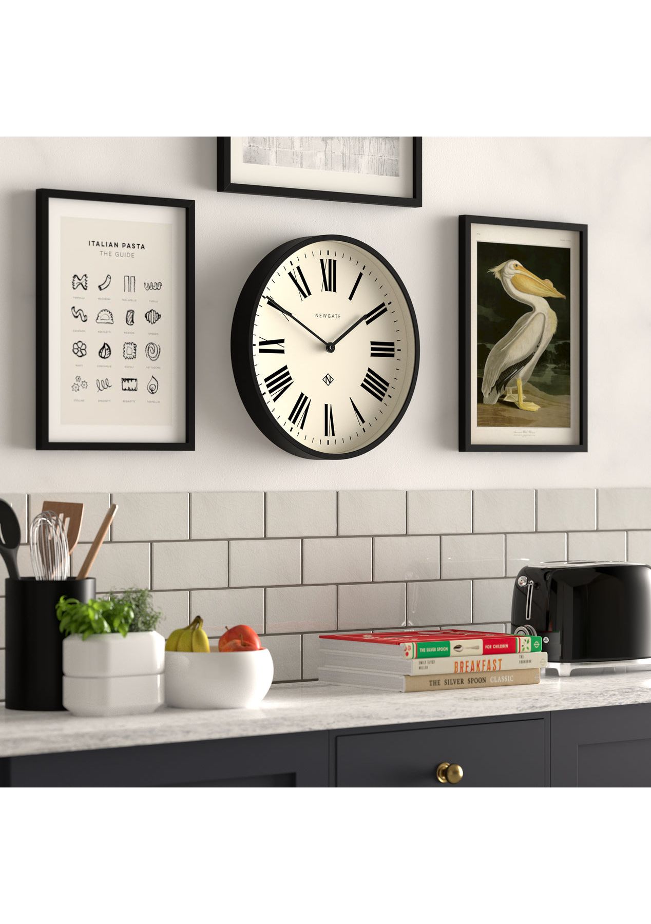 Newgate Number Three Italian Black A Roman numeral wall clock with a modern matt black finish. The Italian combines contemporary style with a classic Roman numeral dial to create a timeless look suited to any interior. A wall clock is the perfect way to create a focal point within a room, adding style to the interior as well as being a practical addition to the home. Designed in Britain, our wall clock collection makes the ideal addition to the kitchen, living room, hallway or office. - Dimensions: HWD 37 x 37 x 4.6cm; 2kg- Materials: Acrylic case with a matt finish, metal hands and glass lens- Colour: Matt Black- Movement: Quartz. This is a ticking clock. - Power: Requires 1 x high quality branded alkaline AA battery (not included)