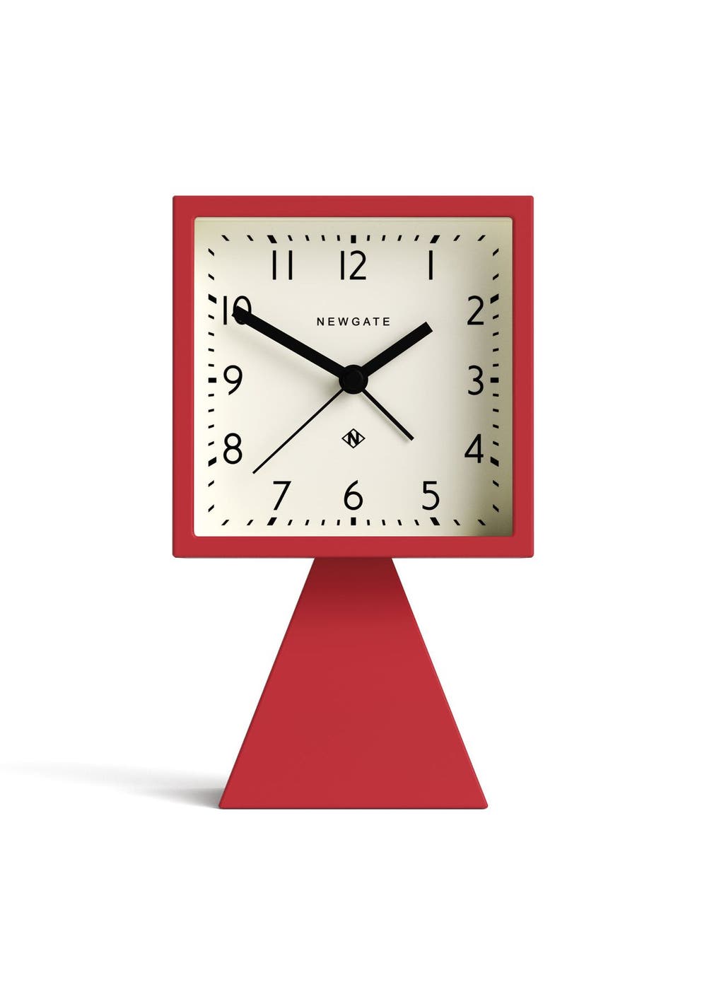 Newgate Brian Alarm Clock Fire Engine Red Mid-Century Retro Alarm/Desk Clock | Silent 'No Tick' | Matt Fire Engine RedAn alarm clock with a contemporary matt red case and Arabic dial is framed by a minimalist square case and supported by a unique pyramid stand.Known as ‚silent sweep‚ in the industry, the hands move in a constant sweeping motion rather than a stepped tick. So you won‚t hear any ticking but if your hearing is particularly sensitive in a completely silent room you may hear a very quiet whirring. - Material: Acrylic, Paper, Metal Hands, Glass- Colour: Red w/ Cream- Movement: Quartz 'Silent Sweep'- Power: 1 x AA Battery Required (Not Included)- Dimensions: LWH 9 x 36 x 41.70- Weight: 1.67kg