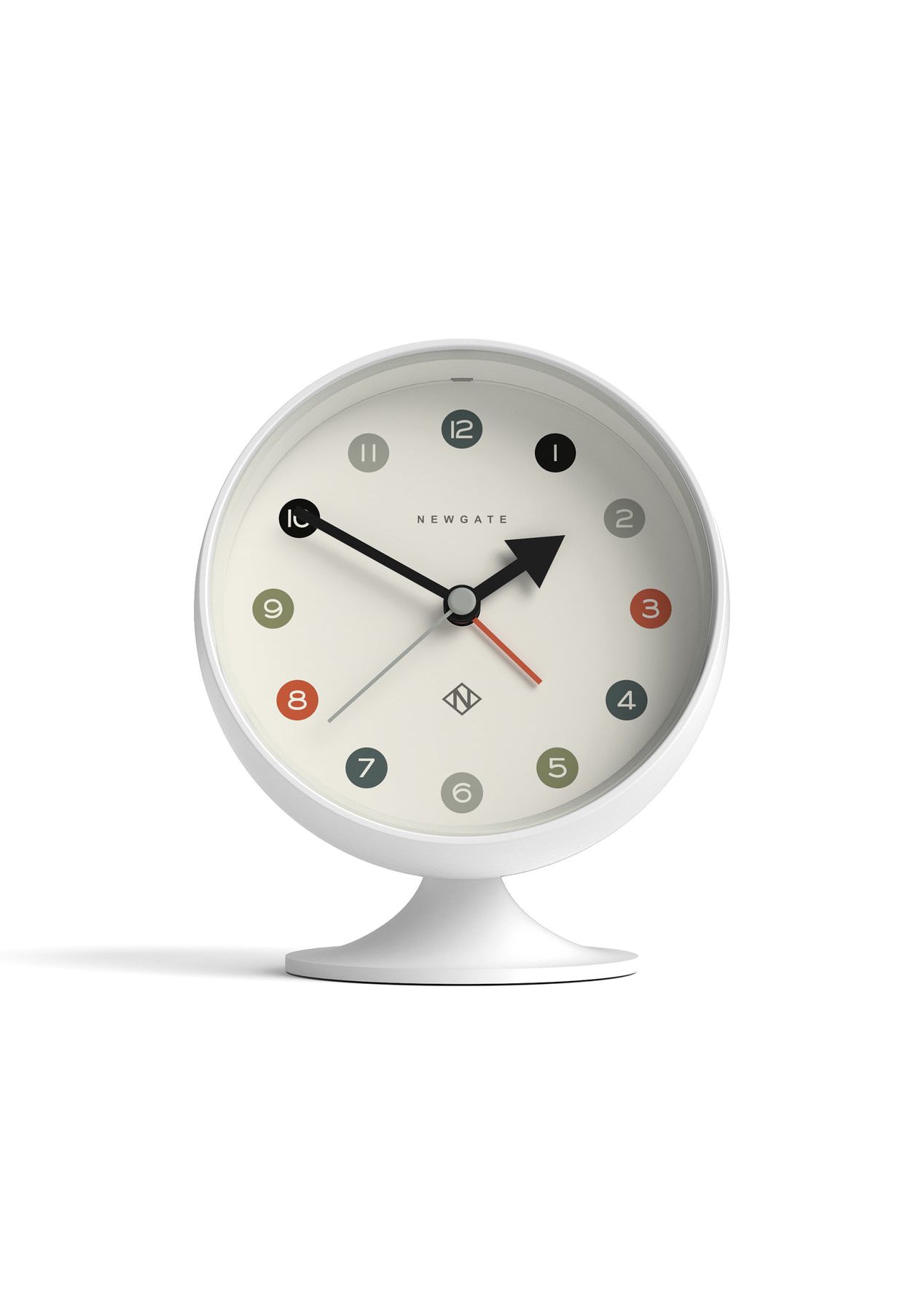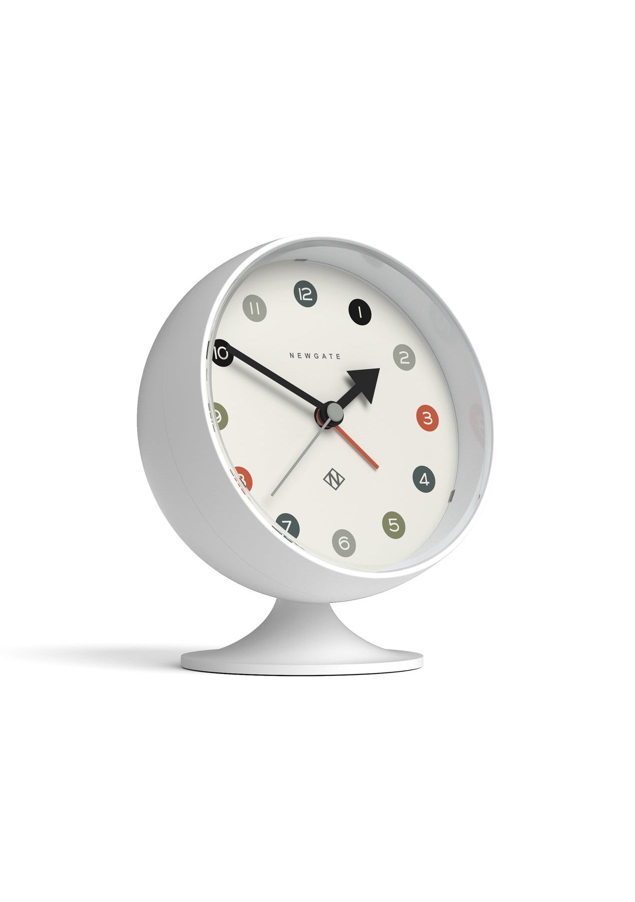 Newgate Spheric Alarm Clock White Mid-Century Alarm/Desk Clock | Silent 'No Tick' | Matt Pebble Whi statement 1970's style spherical alarm clock with a tilted Arabic dot dial and metal pointer hands. The acrylic clock and stand has a matt finish, with an acrylic lens, and a digital alarm sound.Known as ‚silent sweep‚ in the industry, the hands move in a constant sweeping motion rather than a stepped tick. So you won‚t hear any ticking but if your hearing is particularly sensitive in a completely silent room you may hear a very quiet whirring.- Size: HWD 14 x 11.5 x 9cm; 0.16kg- Materials: Acrylic, Metal Hands, Acrylic- Colour: White- Movement: Quartz ‚Silent Sweep‚- Power: Requires 1 x high-quality branded alkaline AA battery (not included)