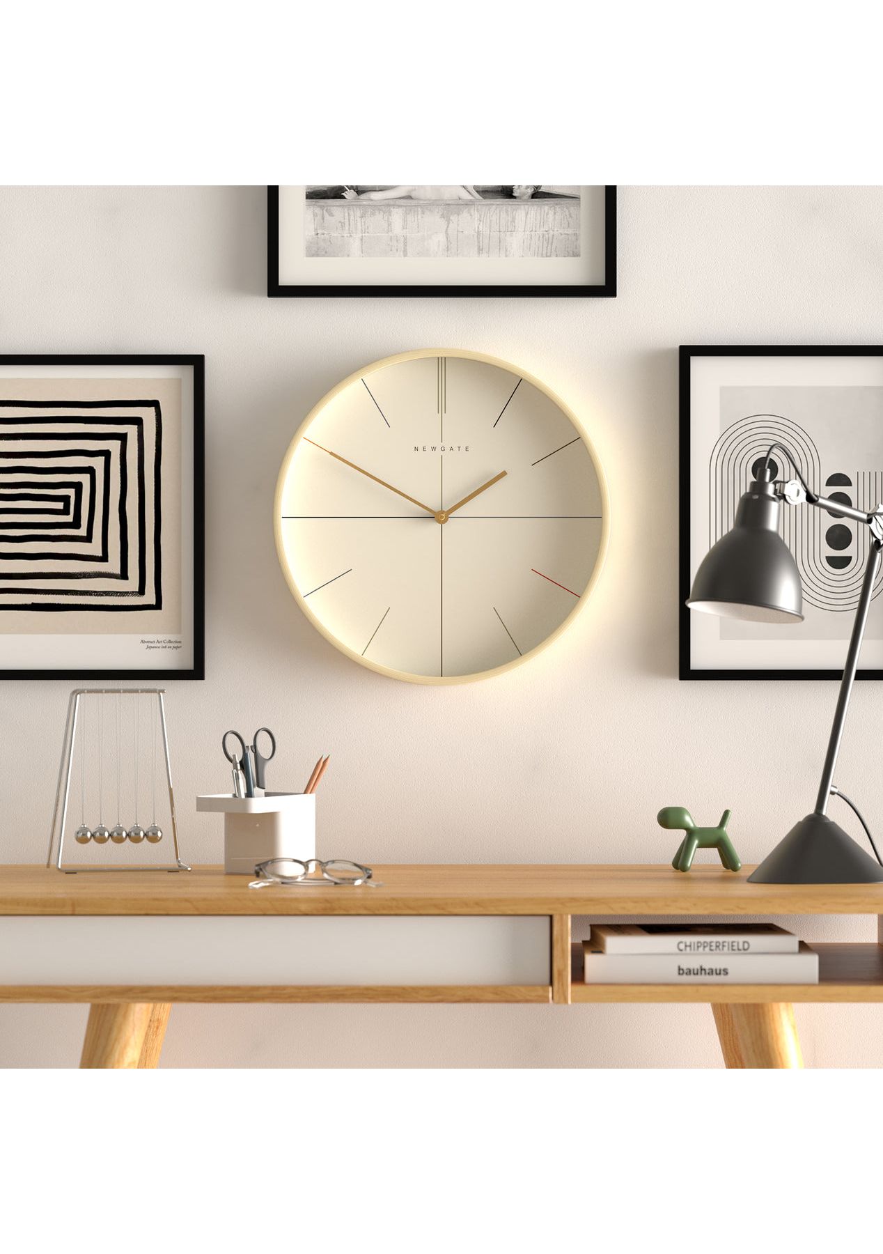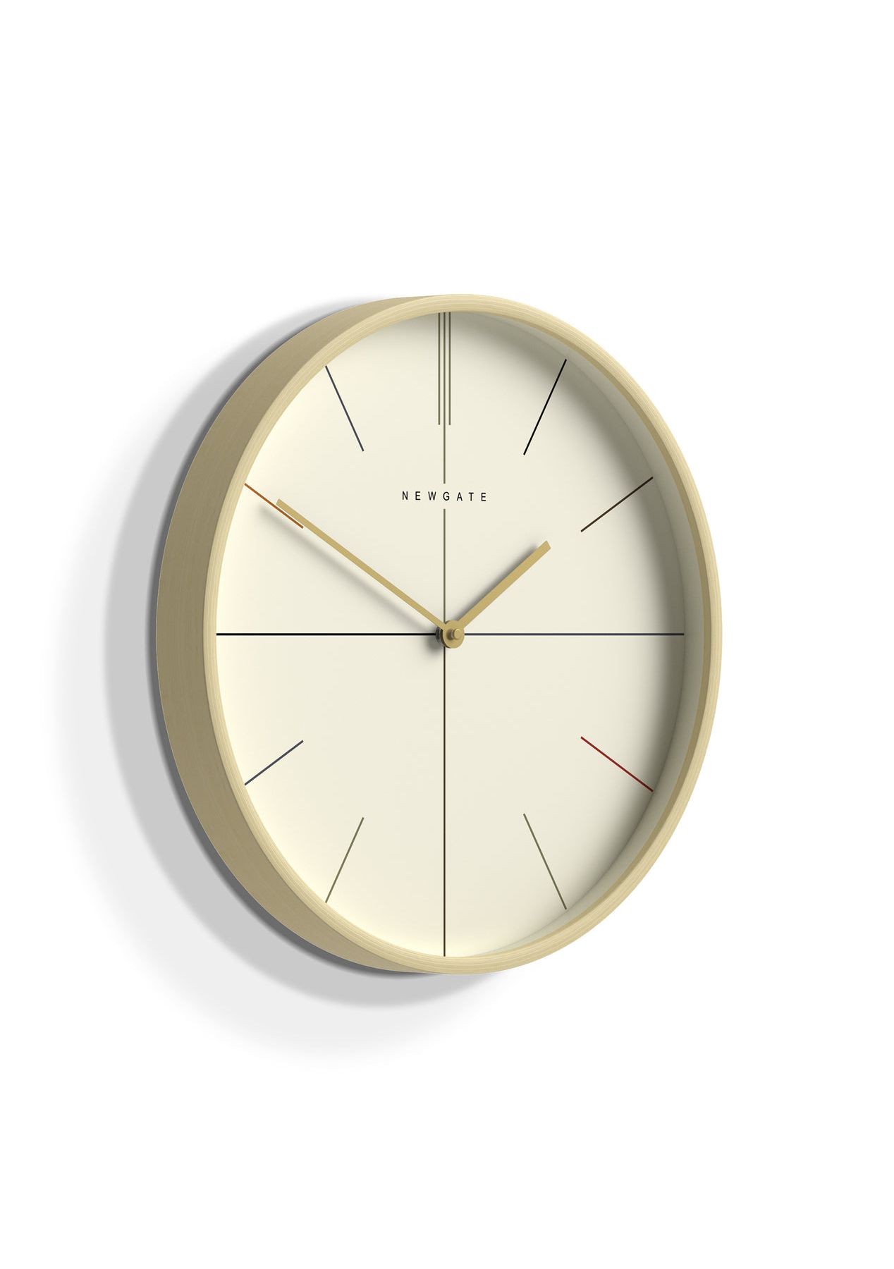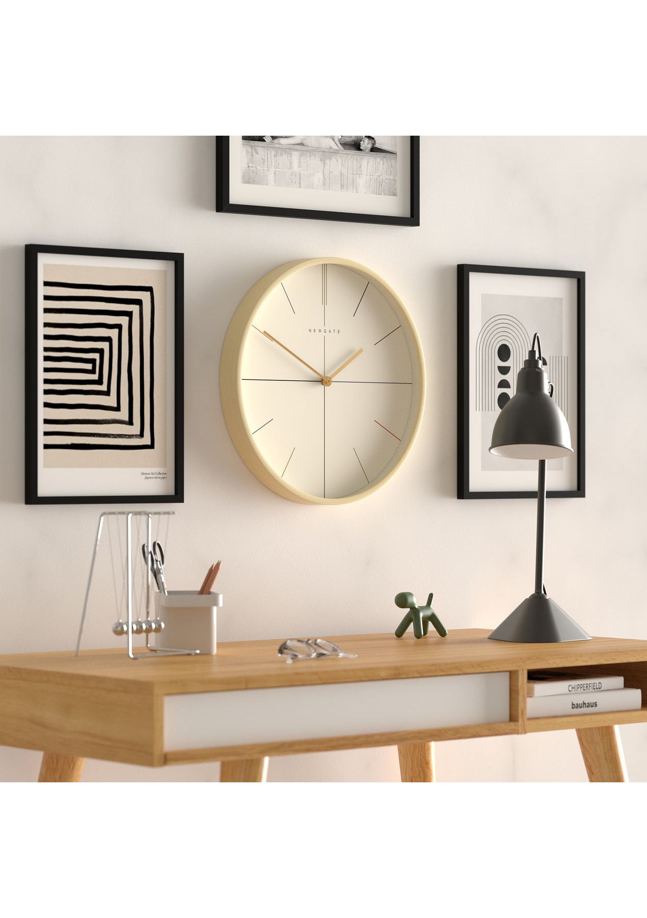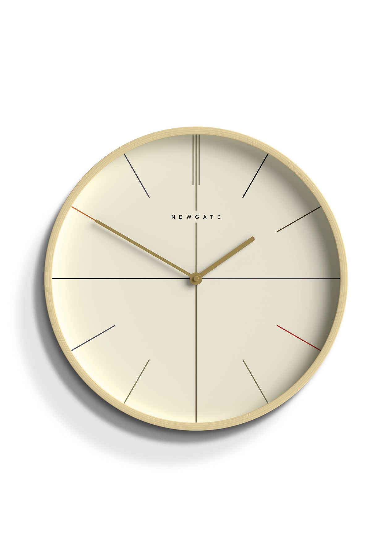 Newgate Mr Clarke Clock Pale Wood Hockey Dial A large modern wall clock in a pale plywood case, with a colour marker dial and contrasting gold hands. Ideal within a contemporary interior, this large wood wall clock creates a modern focal point in the kitchen, living room or office.Please note, this clock is made from real wood so there may be slight variations in the colour and grain as well as some natural wood knots, lines and joins. A faint tick can be heard in a totally silent environment such as a bedroom. - Dimensions: HWD 40.5 x 40.5 x 4.5cm; 1.28kg- Materials: Pale plywood, Metal, Glass- Colour: Pale plywood- Movement: Quartz. This is a faint ticking clock.- Power: Requires 1 x high quality branded alkaline AA battery (not included)