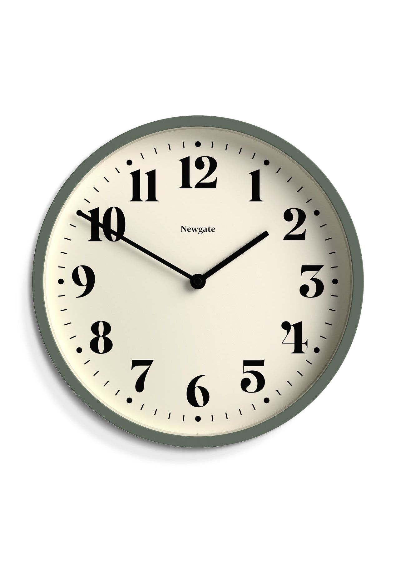 Newgate Number Four Wall Clock Matte Asparagus Green A modern wall clock with a contemporary theatre dial and matt asparagus green painted case. Suitable in any space from the kitchen and office to the modern bedroom. - Dimensions: HWD 30 x 30 x 4.3cm; 0.6kg- Materials: Acrylic case, metal hands and glass lens- Colour: Matte asparagus green- Movement: Quartz. This is a ticking clock. - Power: Requires 1 x high quality branded alkaline AA battery (not included)
